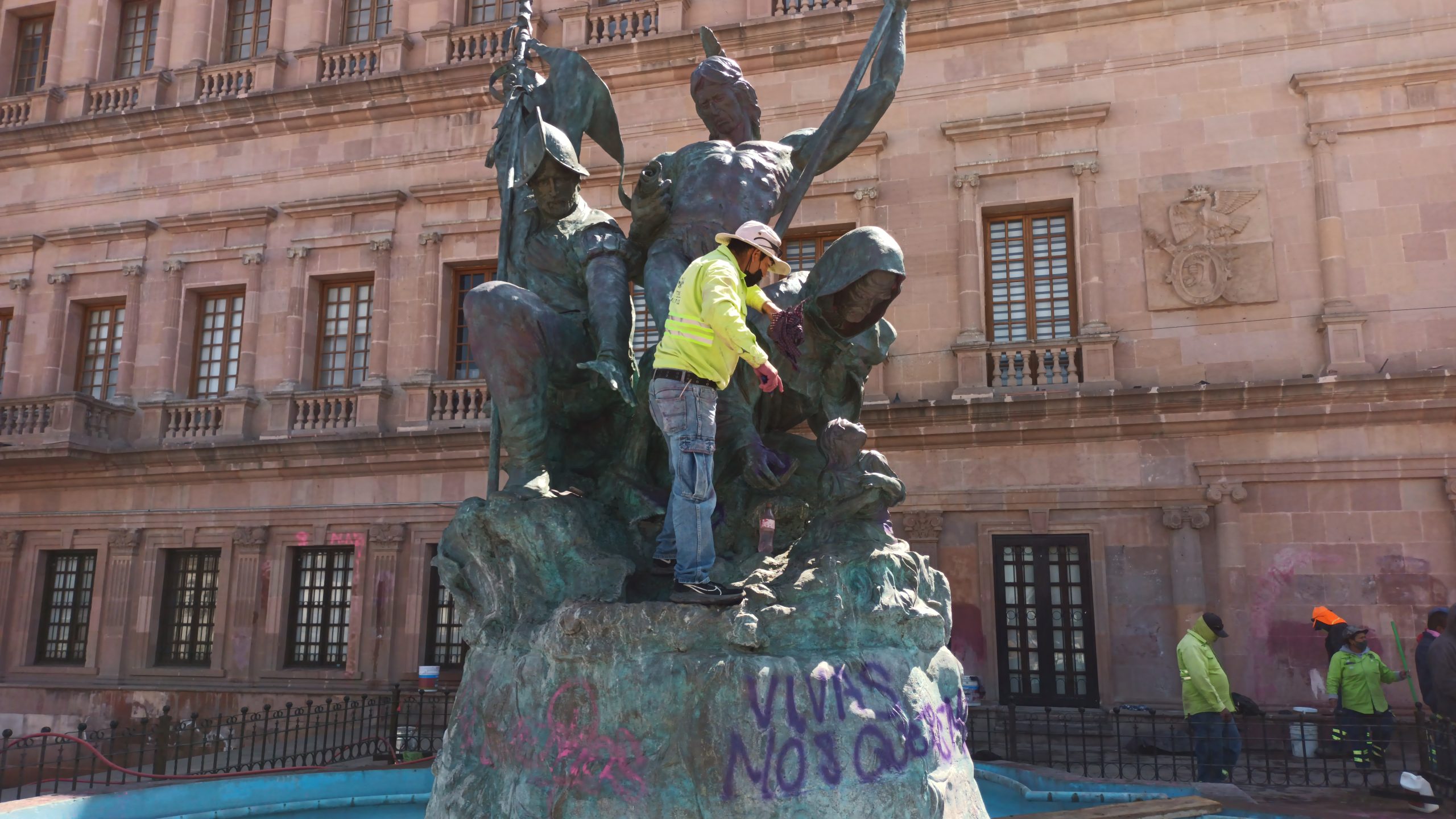 Igualmente, se llevaron a cabo trabajos de limpieza en la estatua de bronce ubicada en esa plaza, obra del escultor Alejandro Fuentes Quezada, cuya altura de cinco metros no fue impedimento para que las manifestantes realizaran pintas con aerosol en varias partes de ese conjunto escultórico que representa uno de los principales símbolos de Saltillo. (ÁNGEL AGUILAR/ EL HERALDO)