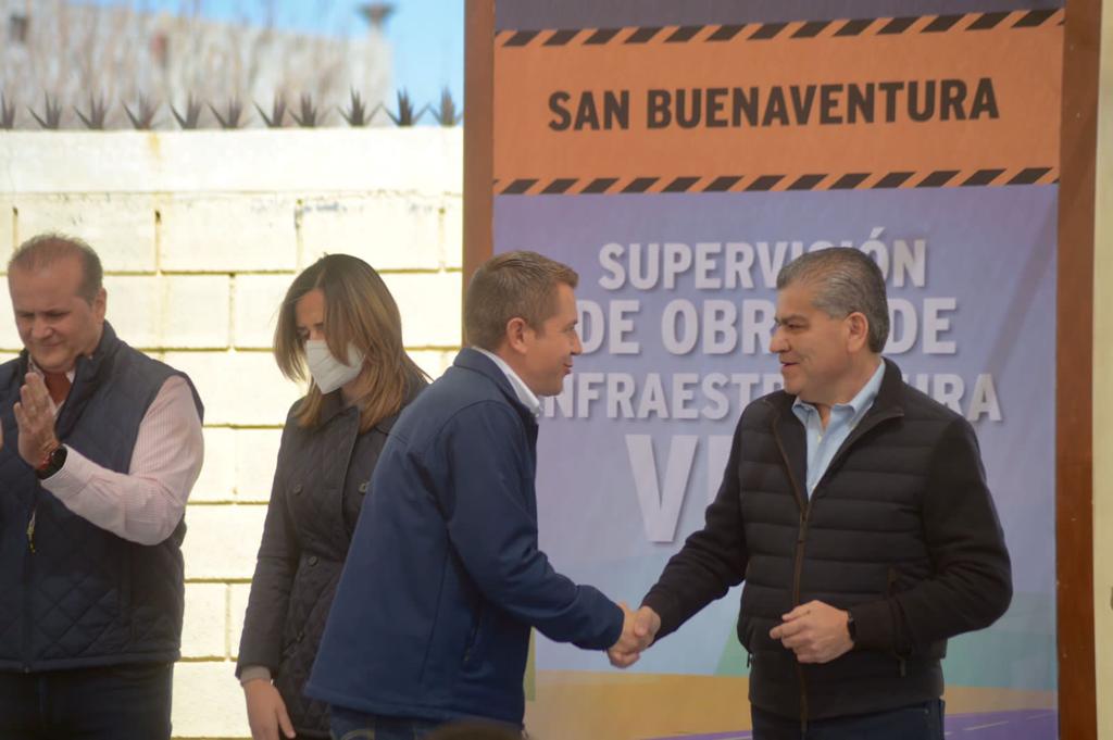 En San Buenaventura, Riquelme Solís supervisó las obras de pavimentación y recarpeteo que se llevan a cabo en esta localidad, acompañado del alcalde Hugo Iván Lozano Sánchez, a quien refrendó su compromiso de trabajo conjunto, y reiteró ser un aliado de San Buenaventura.
