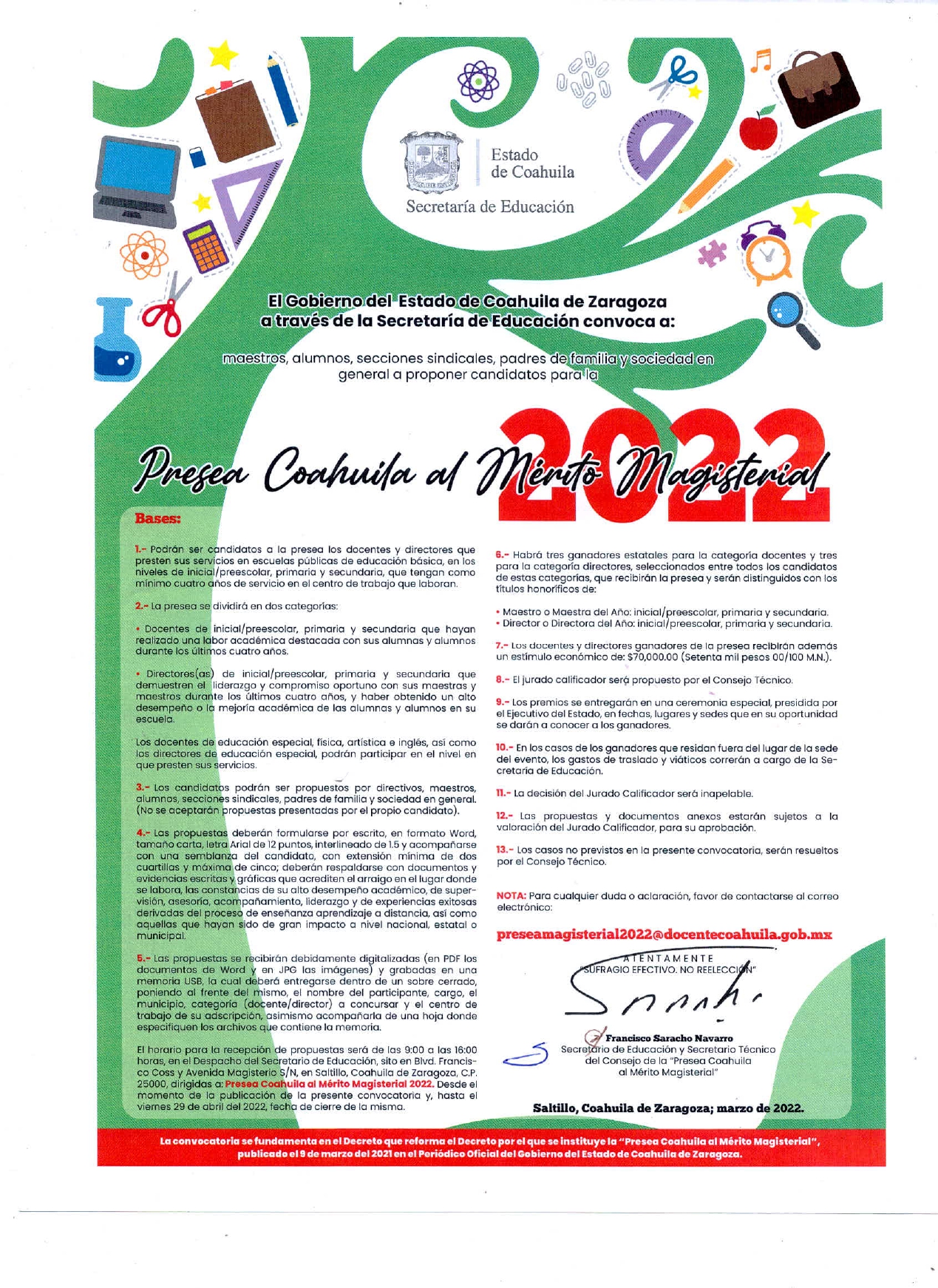 Para reconocer a los docentes que hayan realizado una labor destacada y a los directores que en los últimos cuatro años hayan obtenido un alto desempeño y mejoría académica de sus alumnas y alumnos, el Gobierno del Estado, a través de la Secretaría de Educación, convoca a participar en la Presea al Mérito Magisterial 2022.