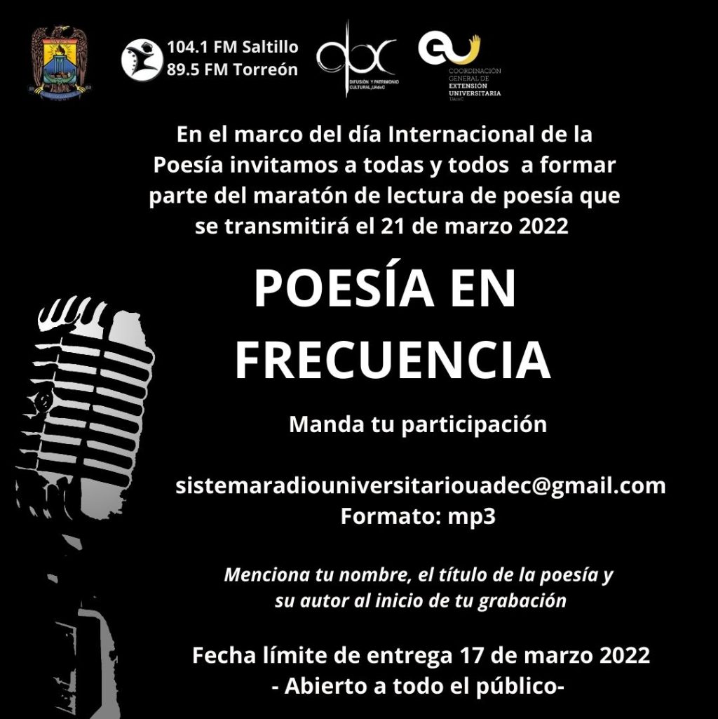 Para celebrar el Día Internacional de la Poesía, la Universidad Autónoma de Coahuila, por medio de su Sistema Universitario de Radio, Coordinación de Difusión y Patrimonio Cultural y la Coordinación de Extensión Universitaria, convoca a la comunidad de esta institución educativa y al público en general a participar en su maratón radiofónico «Poesía en Frecuencia», que se transmitirá este 21 de marzo por la estaciones 104.1 en Saltillo y 89.5 en Torreón, ambas de Frecuencia Modulada (FM).