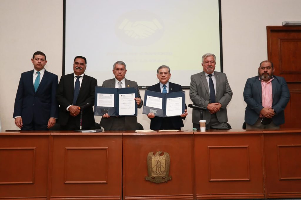 El convenio se signó en la Sala de Seminarios de la UN, donde se contó con la presencia del rector de la máxima casa de estudios, Salvador Hernández Vélez, el director de Investigación y Posgrado, Cristóbal Noé Aguilar González, el coordinador general de Vinculación e Innovación Productiva, Jesús Octavio Pimentel Martínez y el coordinador de la Unidad Norte, Luis Carlos Talamantes Arredondo, así como directores, comunidad estudiantil y docente de la UN.