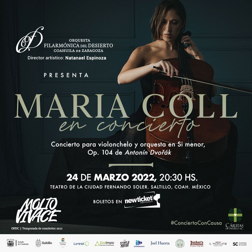 María Coll, quien llega directo de su natal Barcelona, dotada de una espectacular y virtuosa ejecución, bajo la dirección del maestro Natanael Espinoza, Director Residente de la OFDC, ofrecerán un espectacular concierto, cuyo programa estará integrado por la Obertura de la ópera Rienzi, de Richard Wagner, y el Concierto para violonchelo y orquesta en Si menor Op.  104, de Antonín Dvorák,  con la solista María Coll,  violonchelo, y un espectacular cierre con las Danzas del ballet Estancia Op. 8, Alberto Ginastera, un sensacional concierto que, además, apoya la causa de quienes más lo necesitan, aportando el 50 por ciento del boletaje a Cáritas de Saltillo AC.