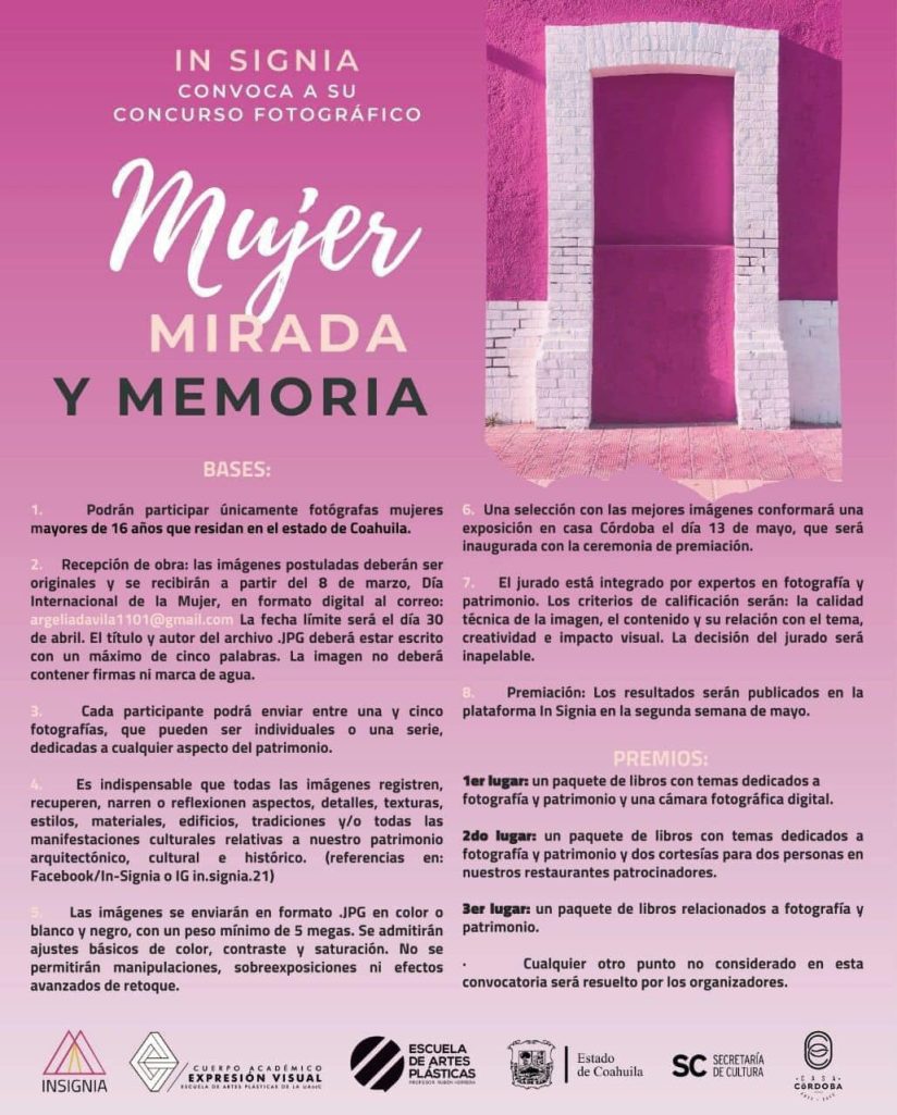 La Escuela de Artes Plásticas “Profesor Rubén Herrera” de la Universidad Autónoma de Coahuila, convoca a fotógrafas mayores de 16 años y residentes en el estado, a participar en el concurso «Mujer, mirada y memoria”, la fecha límite de postulación es el 30 de abril.