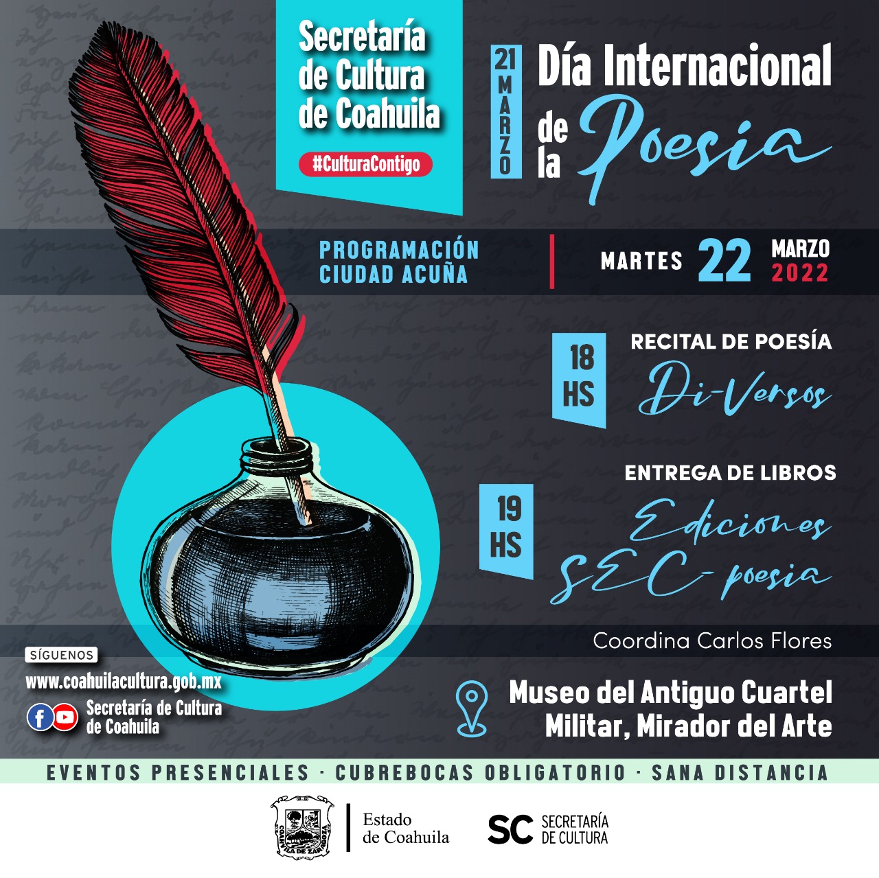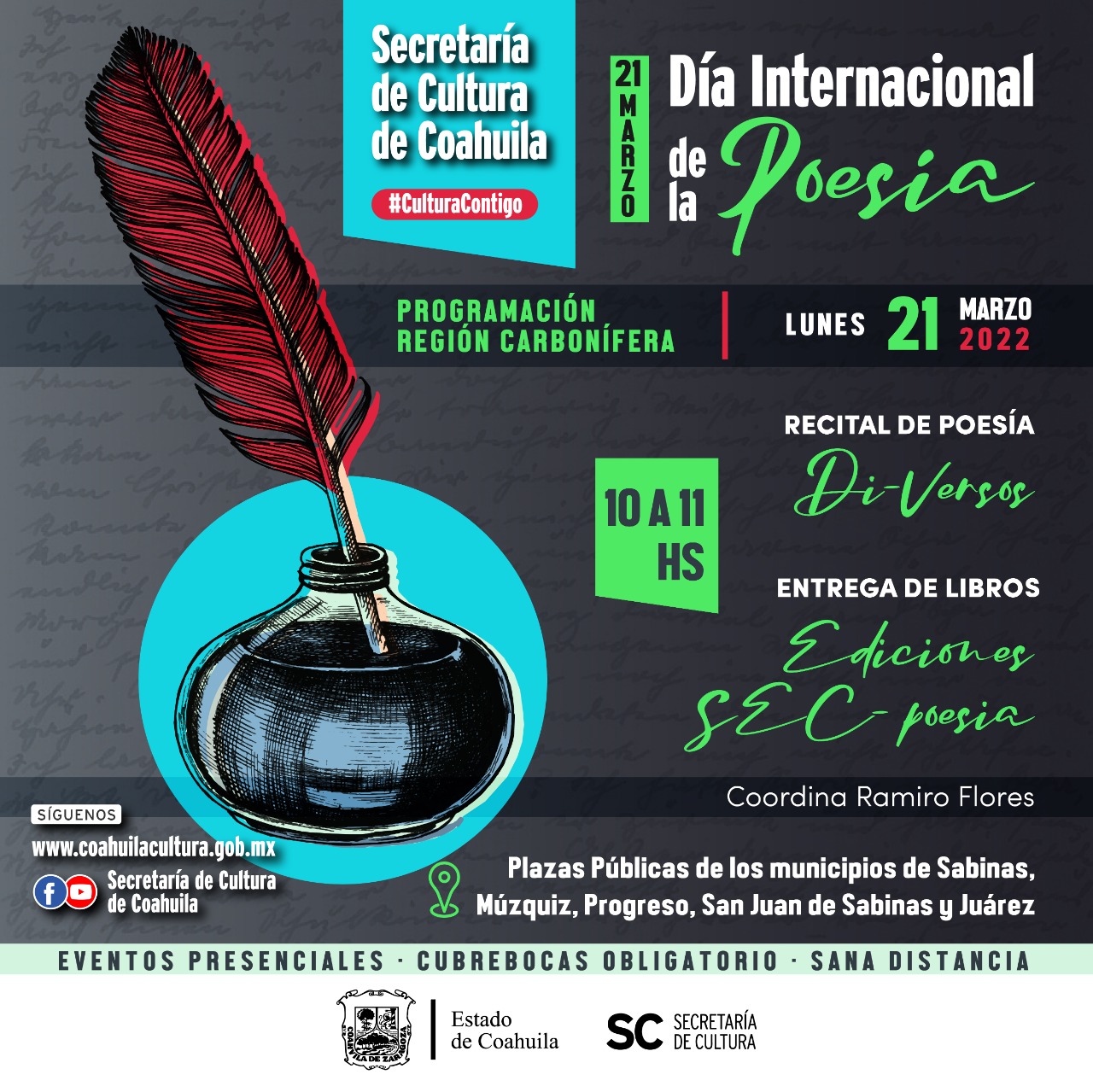 En la Región Carbonífera se celebrará este 21 de marzo, con el “Recital de poesía. Di-Versos” y la entrega de libros, ediciones SEC- poesía, en  las plazas públicas de los municipios de Juárez, Múzquiz, Progreso, Sabinas y San Juan de Sabinas.
