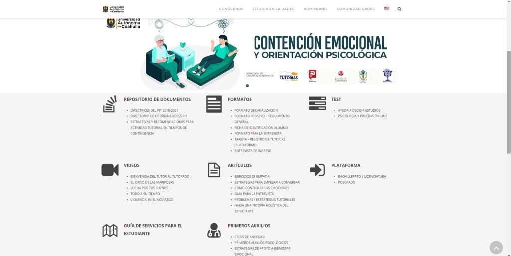 Cuenta con distintos apartados como: Repositorio de Documentos y el de Formatos, que contienen archivos para el registro y control de las tutorías, así como las secciones de Test, Videos informativos, Artículos de consulta, Consejos sobre primeros auxilios y los enlaces de acceso a la plataforma del Programa de Tutorías de Bachillerato-Licenciatura y Posgrado de la UA de C.