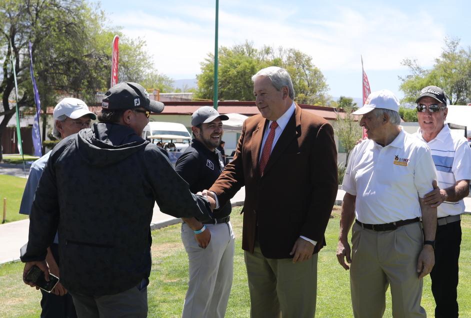 José María Fraustro Siller, alcalde de Saltillo, dio el “escopetazo” inicial con el que 168 jugadores locales y externos iniciaron el torneo de golf, “Juega por Ayudar”, en el Club Campestre, que organiza el Banco de Alimentos y participa el DIF Coahuila.