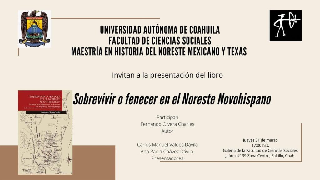 Como parte de las actividades de la Maestría en Historia del Noreste Mexicano y Texas, la Facultad de Ciencias Sociales de la Universidad Autónoma de Coahuila invita a la presentación del libro “Sobrevivir o fenecer en el noreste novohispano” del Dr. Fernando Olvera Charles, el próximo jueves 31 de marzo a las 17:00 horas en la Galería del plantel, ubicado en la calle Juárez 139 del Centro Histórico.