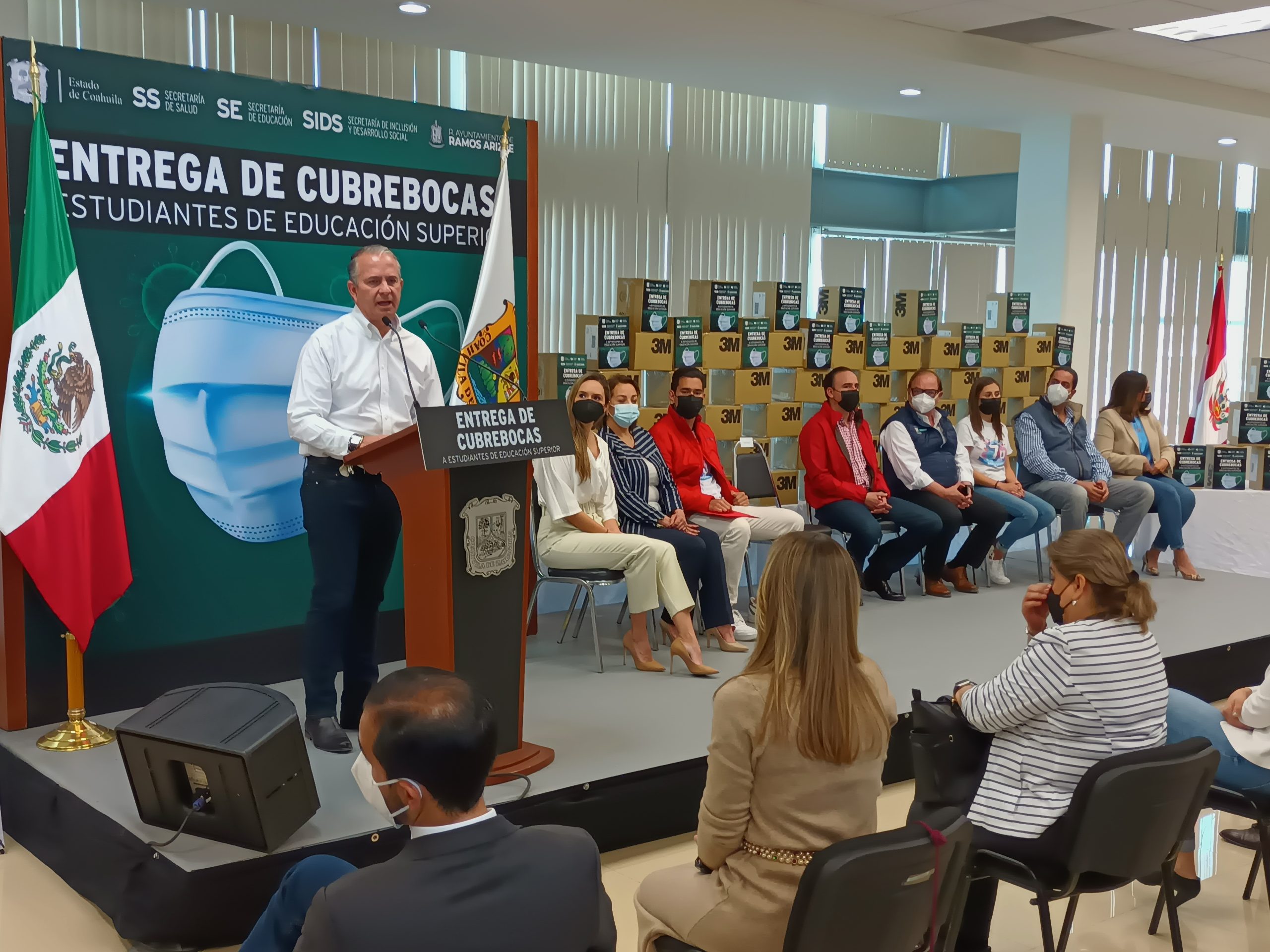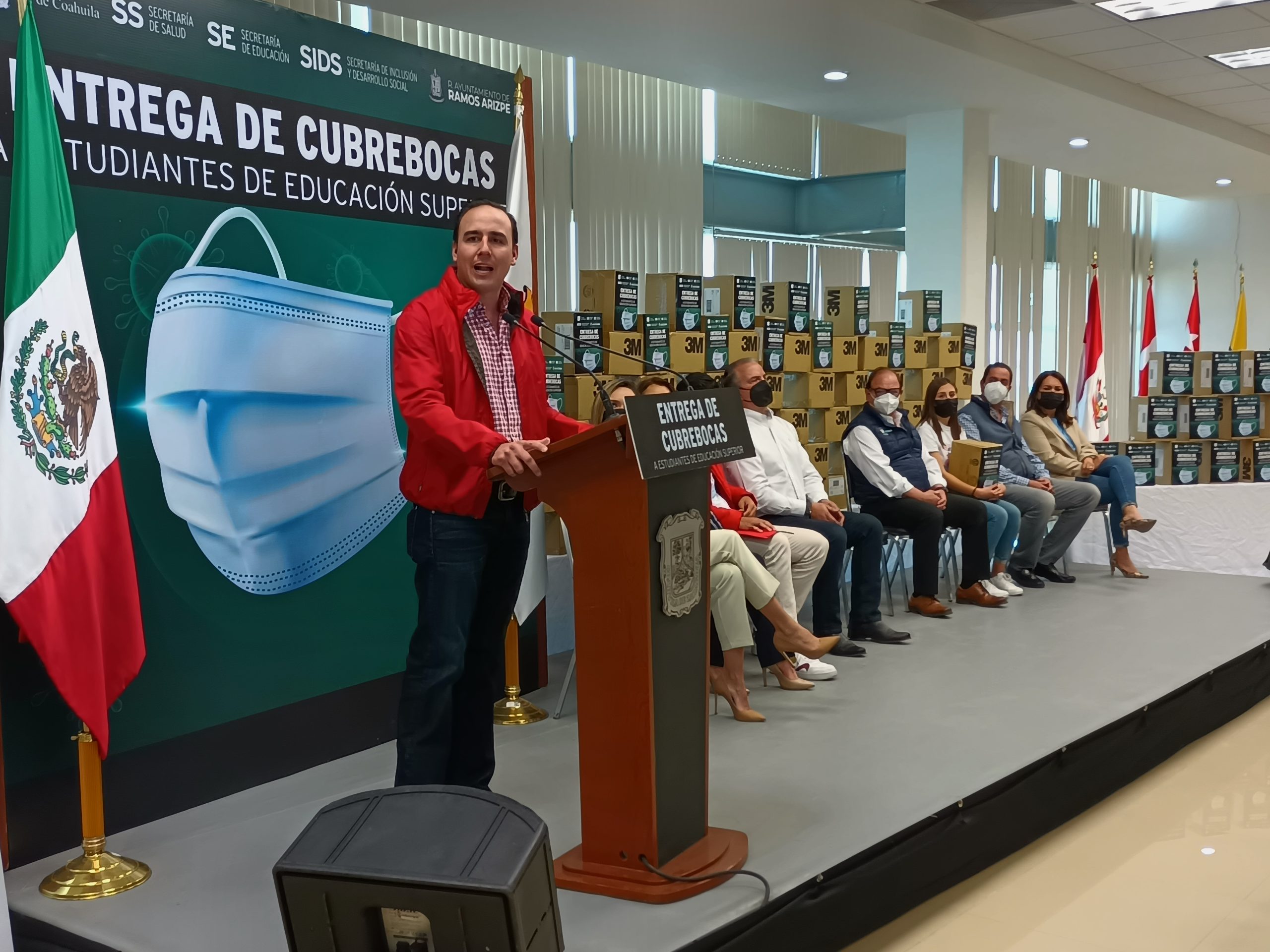En el marco del acuerdo social Mejora Coahuila, este viernes se llevó a cabo la entrega de 200 mil cubre bocas para los alumnos y personal docente y administrativo de la Universidad Politécnica de Ramos Arizpe (UPRA), con el propósito de apoyar en las labores de prevención del COVID-19 en esa casa de estudios, y coadyuvar con los esfuerzos del Gobierno Estatal para mantener controlada la pandemia, además de equilibrar la reactivación económica.