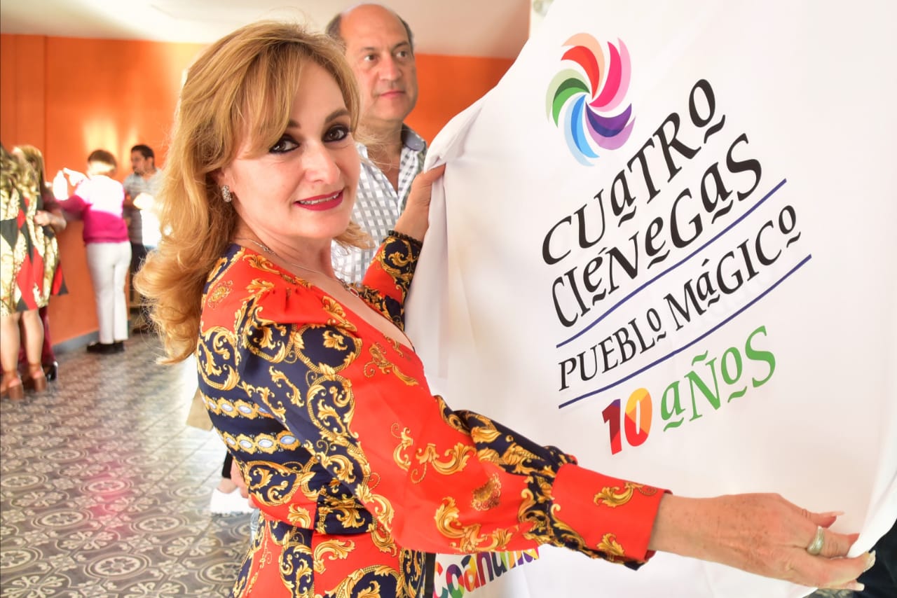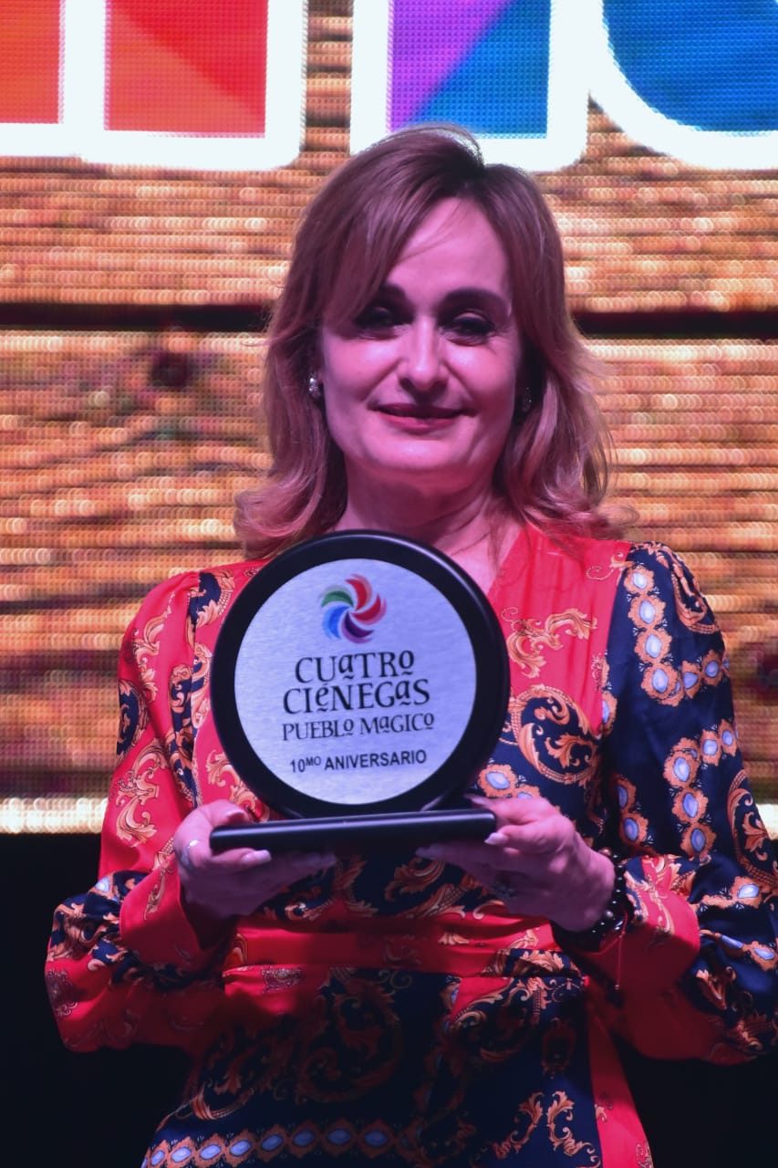 Posteriormente se llevó a cabo una ceremonia para celebrar los 10 Años de Pueblo Mágico de Cuatro Ciénegas, en la Plaza Principal, donde se entregaron reconocimientos, entre otros, a la Directora de Planeación y Desarrollo Turístico de SECTUR Coahuila, quien en su momento tuvo la responsabilidad de documentar y elaborar la propuesta conjunta para postular a este municipio como Pueblo Mágico ante la Secretaría de Turismo Federal.
