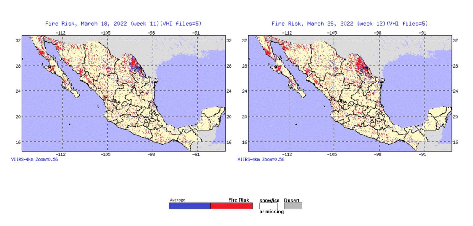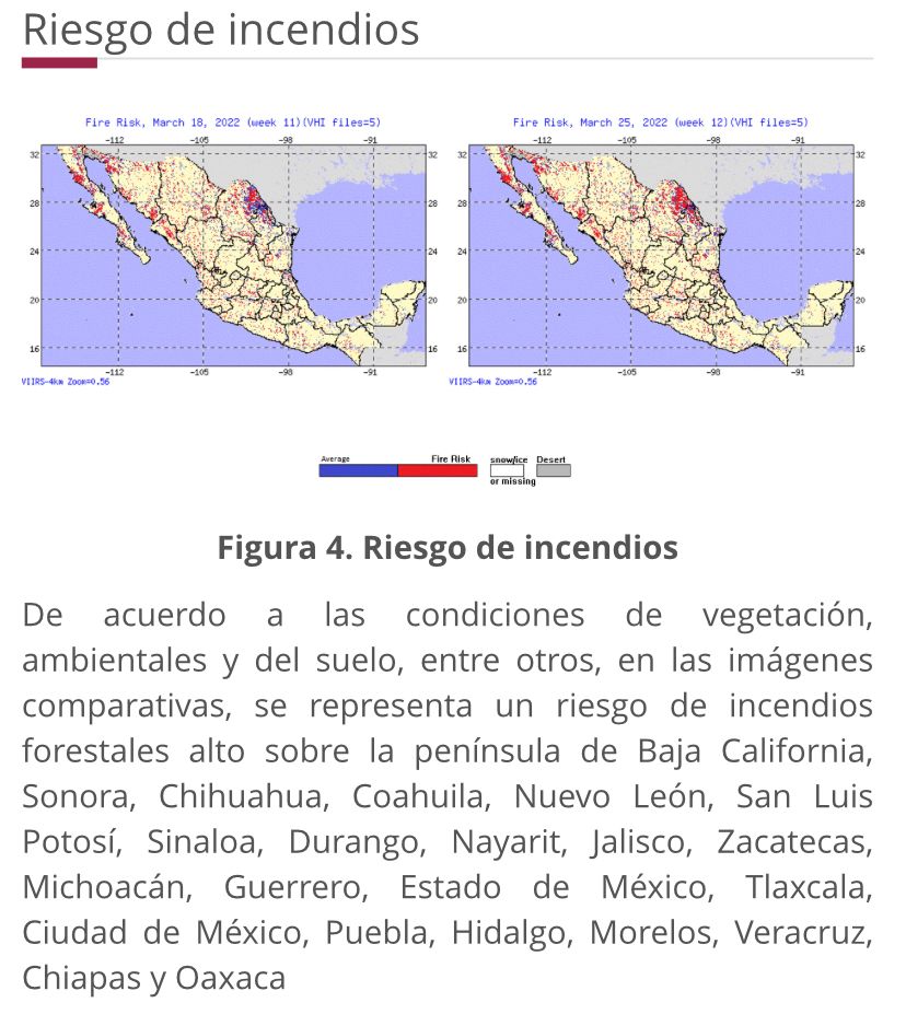 El riesgo de generación de incendios forestales por condiciones meteorológicas es muy alto en zonas de Chihuahua, Coahuila, Jalisco, Aguascalientes, Michoacán, Estado de México, Ciudad de México, Morelos Hidalgo, Guerrero, Tlaxcala y Puebla.