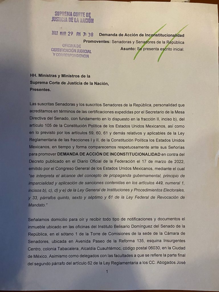 Ciudad de México.- El martes, las y los Senadores del PAN, PRI, PRD y Grupo Plural presentaron una Acción de Inconstitucionalidad ante la Suprema Corte de Justicia de la Nación (SCJN) en contra del Decreto de interpretación auténtica del concepto de “propaganda gubernamental”, dentro del procedimiento de la Revocación de Mandato, publicado el pasado 17 de marzo pasado en el Diario Oficial de la Federación (DOF), así como de diversas disposiciones de la Ley General de Instituciones y Procedimientos Electorales y de la Ley Federal de Revocación de Mandato, que buscaban que legisladores, gobernadores y demás servidores públicos, incluido el Presidente de la República, pudieran promover la Revocación de Mandato.