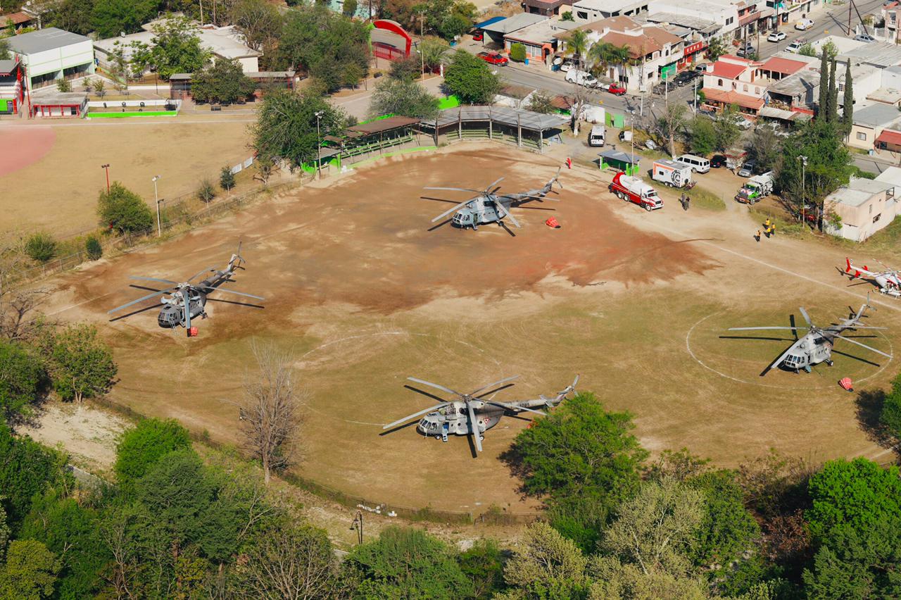 Informó que se identificó en el paraje “Lagunillas” y Mesa del Oso a cuatro helicópteros MI17, H. UHU, aeronave 206 del Gobierno del Estado de Coahuila, laborando en el sitio y realizando descargas.
