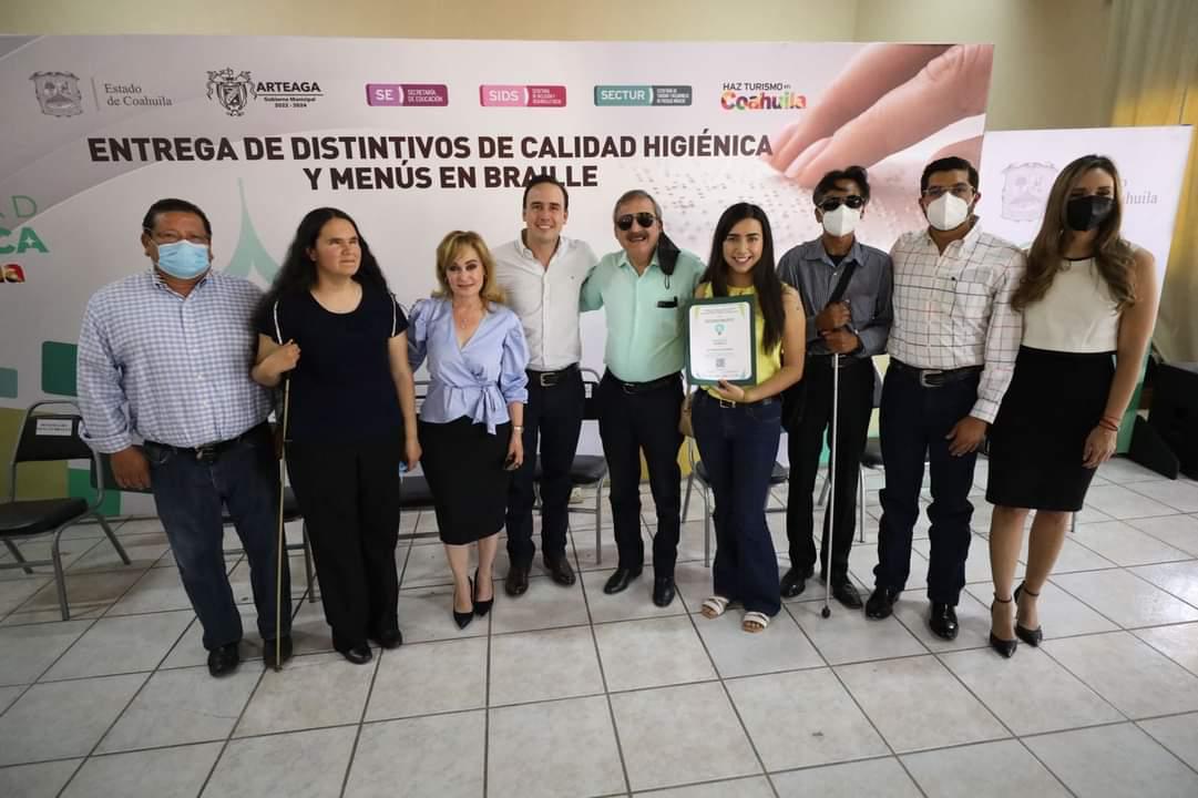 “Con estos ejemplares de menús en Braille, las personas con discapacidad visual que nos visiten podrán ser autosuficientes; a nombre del gobierno del Estado que encabeza en ingeniero Miguel Ángel Riquelme, hago un reconocimiento a los participantes a esta estrategia y los exhorto a que sigan dando lo mejor de sí mismos, sumando esfuerzos y avanzando en unidad hacia una total reactivación económica”, resaltó la Secretaria de Turismo y Desarrollo de Pueblos Mágicos, Azucena Ramos Ramos, resaltó que en el segmento del turismo social e inclusivo que se busca desarrollar en Coahuila, se emprenderán nuevas estrategias de promoción para incentivar la participación y fortalecer la accesibilidad delos turistas con requisitos específicos y personas con discapacidad.