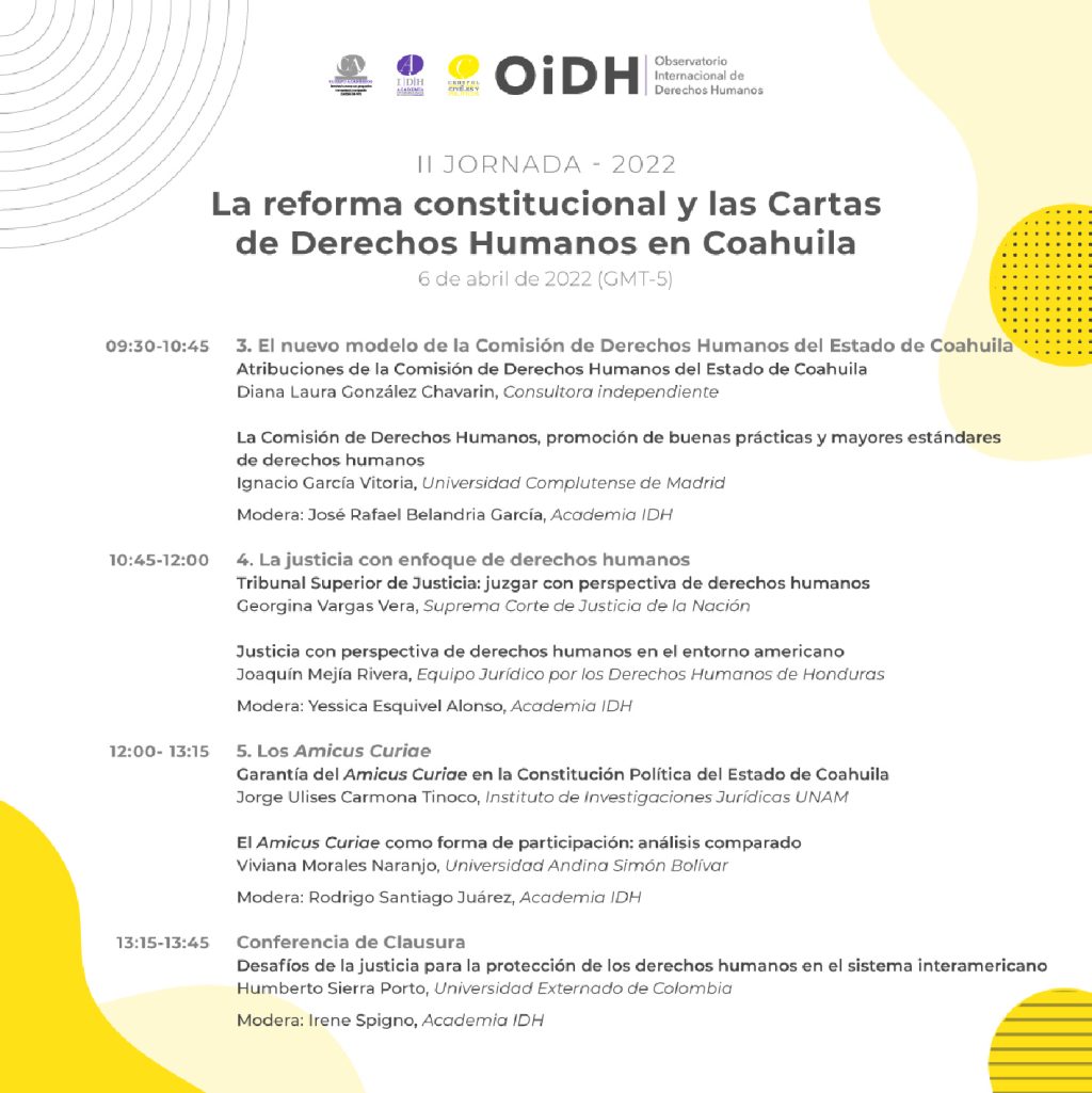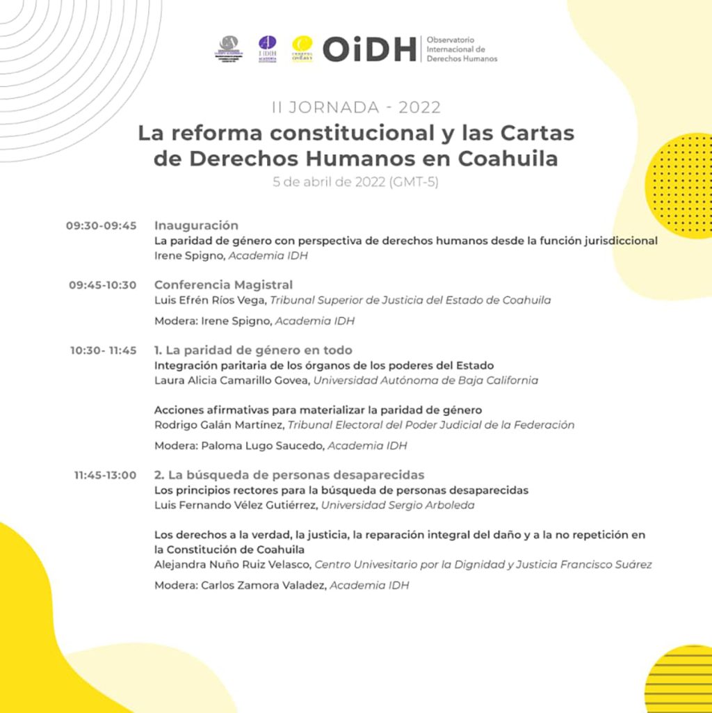 El evento se desarrolla en su segunda jornada de 2022 e inicia el martes 5 de abril a las 9:30 horas, con el acto inaugural a cargo de la directora general de la AIDH, Irene Spigno, posteriormente, se impartirá la conferencia magistral por el miembro de la AIDH y magistrado del Tribunal Superior de Justicia del Estado de Coahuila, Luis Efrén Ríos Vega.