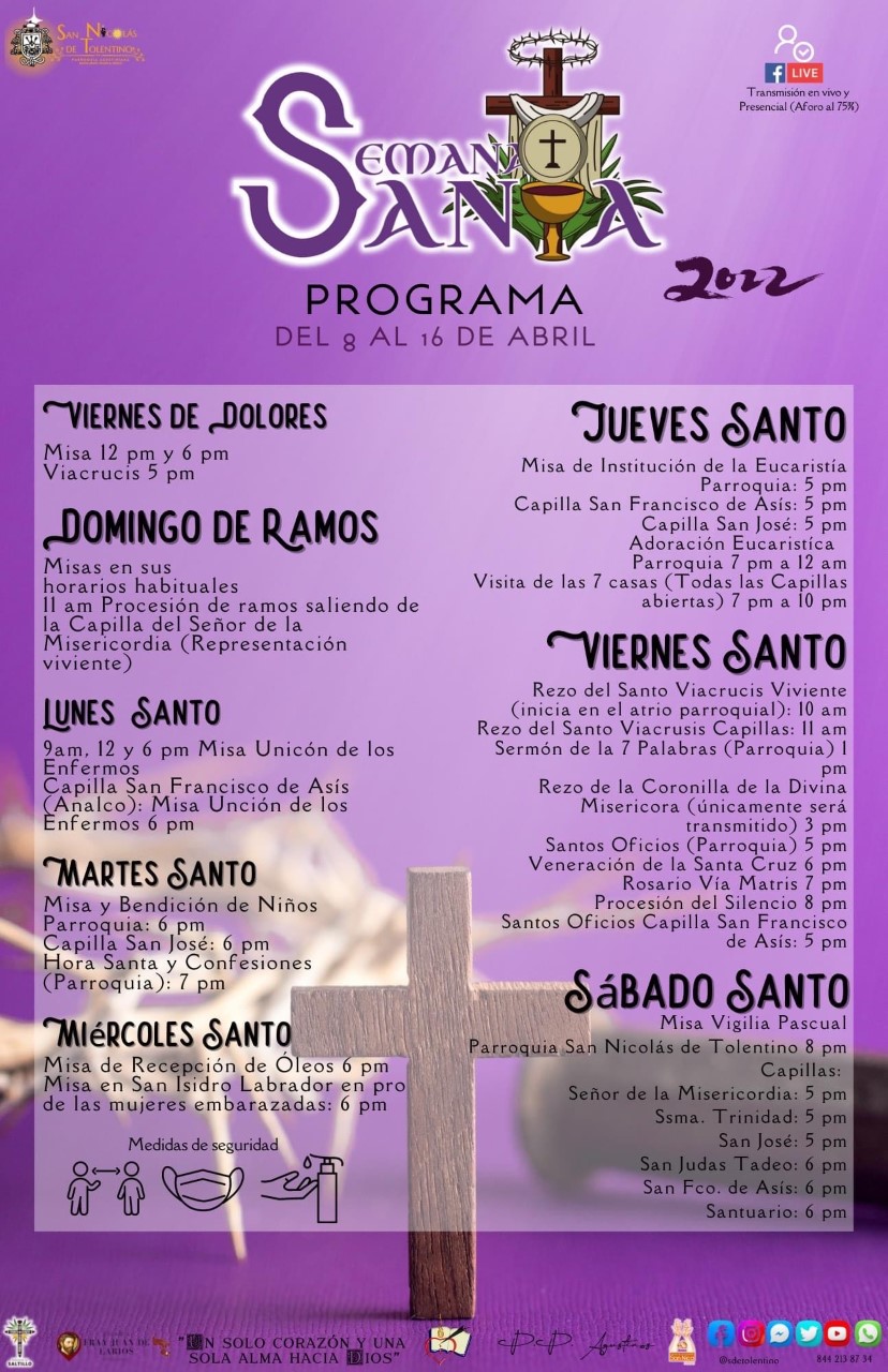 La parroquia de San Nicolás de Tolentino en Ramos Arizpe ha anunciado el programa de actividades referentes a la celebración de la Semana Santa entre el 9 al 16 de abril, días donde se efectuarán distintas misas y peregrinaciones, así como la representación del Viacrucis Viviente, actos que a pesar de la disminución de casos positivos de COVID-19 así como la ocupación hospitalaria, medidas sanitarias como el uso del cubrebocas y procurar la sana distancia se mantendrán. Asimismo, el uso de redes sociales se efectuará para seguir a distancia las actividades religiosas.