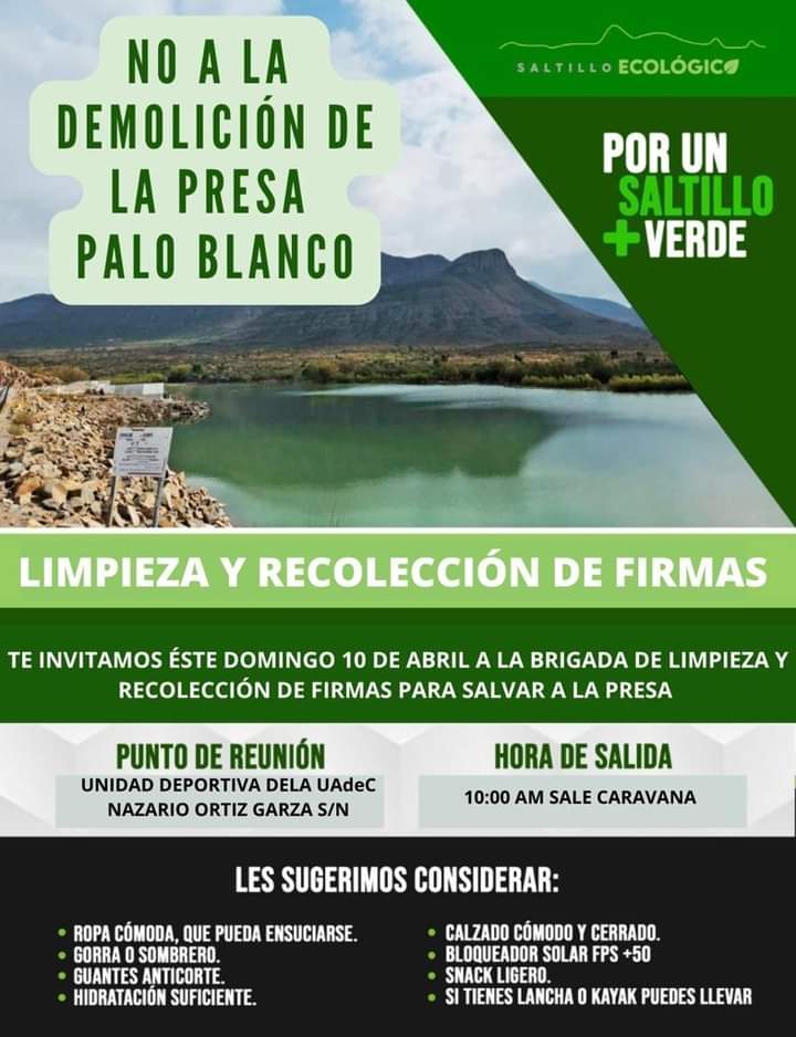 En ese lugar, de acuerdo con la publicación, se realizará una jornada de limpieza y una recolección de firmas entre los participantes para evitar que se dé cumplimiento a la orden de la CONAGUA de demoler la presa Palo Blanco, que aseguran, tiene una fundamental importancia para el medio ambiente, además de ser hogar de numerosas especies de flora y fauna.