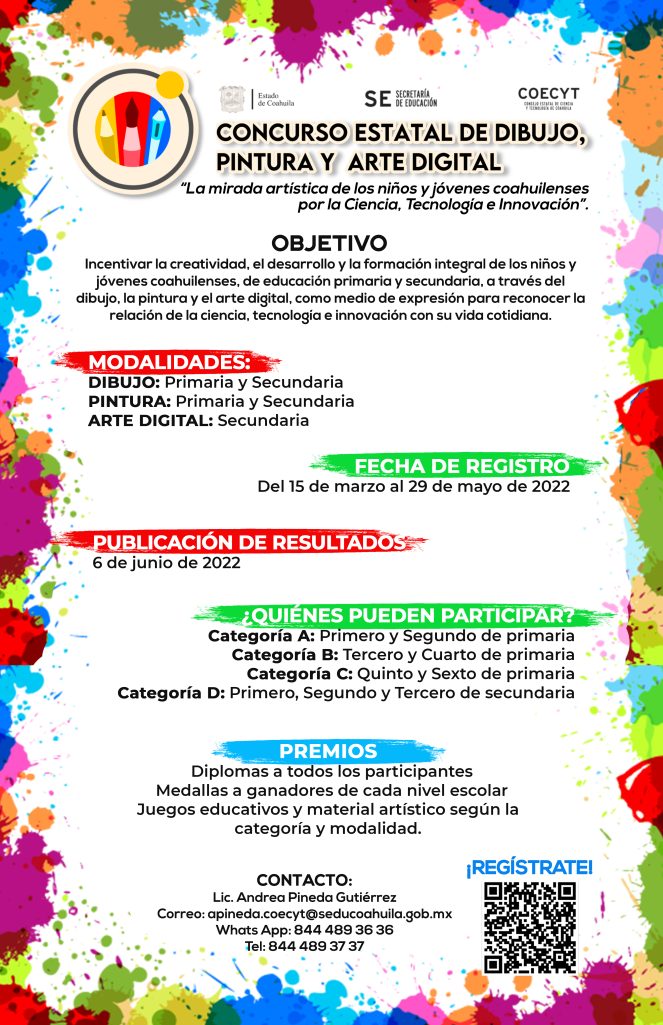 El Estado de Coahuila, a través del Consejo Estatal de Ciencia y Tecnología y en colaboración con la Secretaria de Educación Pública, convocan al 2do Concurso Estatal de Dibujo, Pintura y Arte Digital “La mirada artística de los niños y jóvenes coahuilenses por la Ciencia, Tecnología e Innovación”.