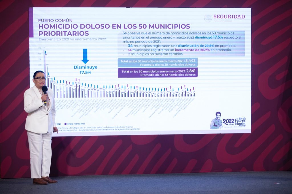 En el caso de la estrategia de atención a los 50 municipios más violentos del país, la funcionaria aseguró que las víctimas de homicidio doloso disminuyeron en 17.5% en el periodo enero-marzo de 2022 respecto al mismo periodo de 2021.