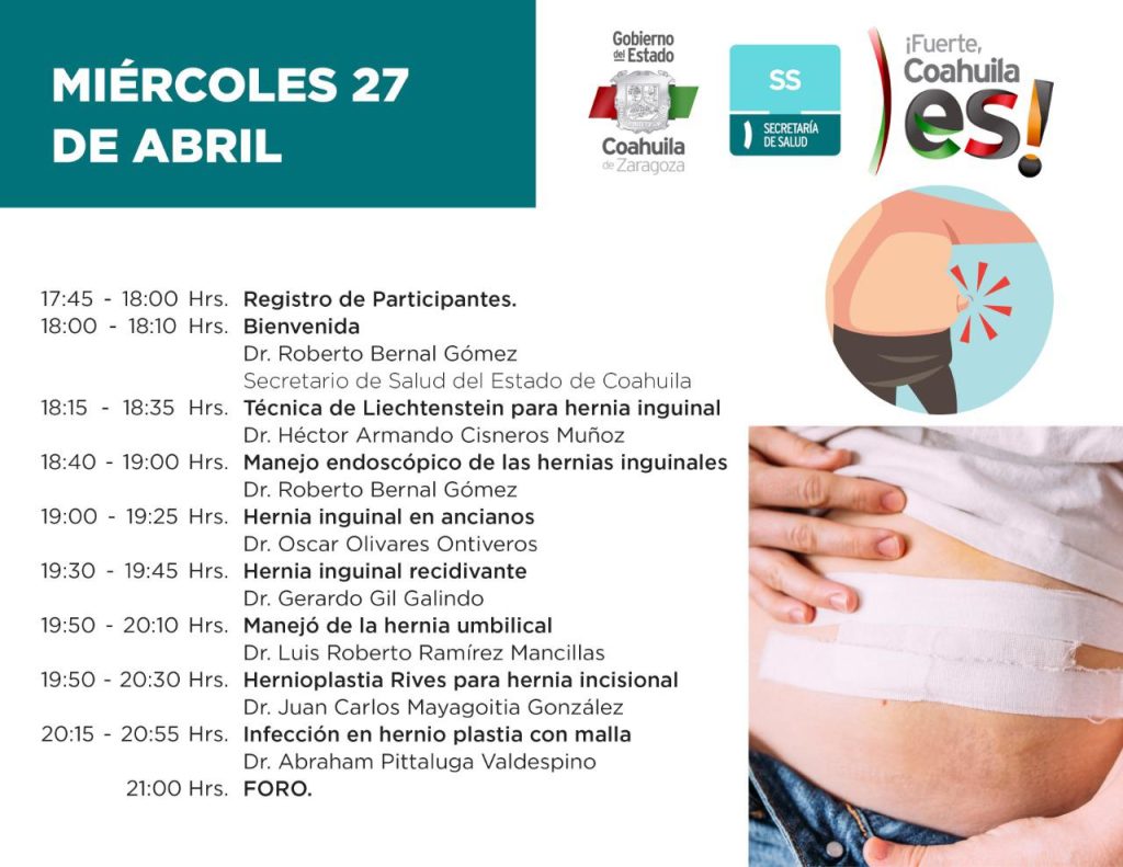 Asimismo, el Secretario de Salud de Coahuila detalló que dentro del simposium se abordaran temas como “Técnica de Liechtenstein para Hernia Inguinal”, “Hernia Inguinal en Ancianos”, “Hernia Inguinal Recidivante”, y “Manejo Endoscópico de las Hernias Inguinales”, esta última a cargo de Roberto Bernal Gómez.
