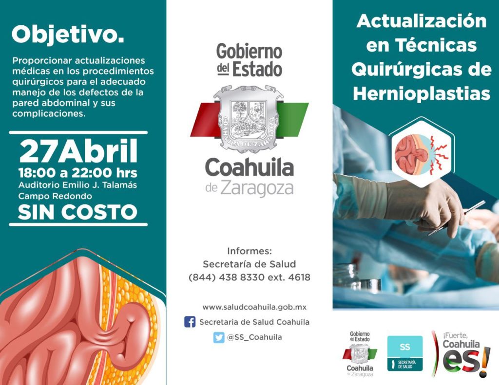 Con el objetivo de brindar herramientas que enriquezcan las capacidades y el conocimiento médico en materia de procedimientos quirúrgicos, la Secretaría de Salud, a través del Gobierno del Estado, convocó al público en general a que acuda al simposium “Actualización en Técnicas Quirúrgicas de Hernioplastias”, en el Auditorio Emilio J. Talamás, ubicado al interior de las instalaciones de Campo Redondo, el 27 de abril a partir de las 18:00 horas y hasta las 22:00 horas.