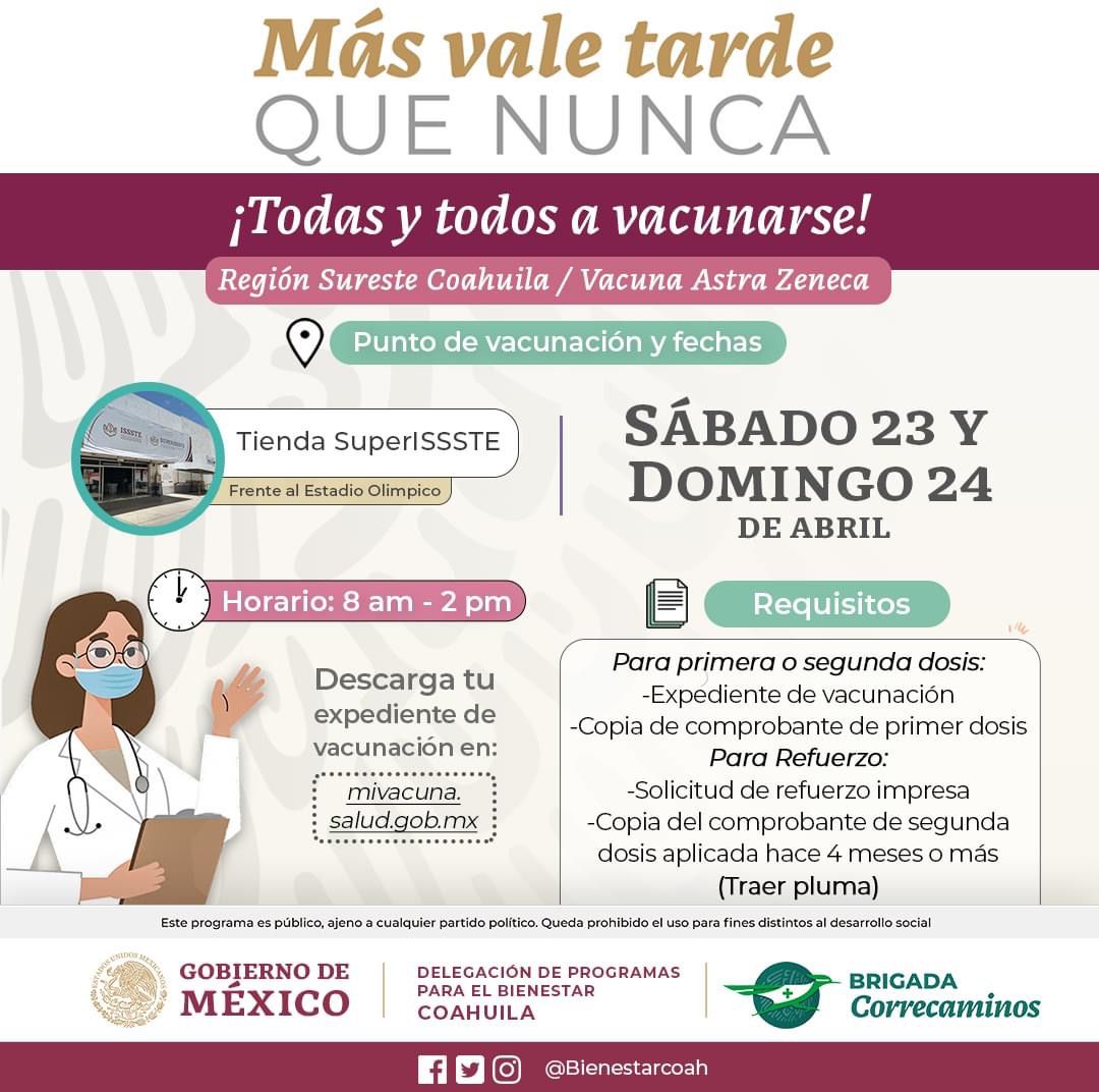 Este sábado, la Secretaría del Bienestar en Coahuila accionó una jornada de vacunación contra la Covid-19 en las instalaciones de Tienda Super ISSSTE, frente al Estadio Olímpico de Saltillo, para inocular con primera, segunda y tercera dosis a cualquier persona mayor de 18 años.