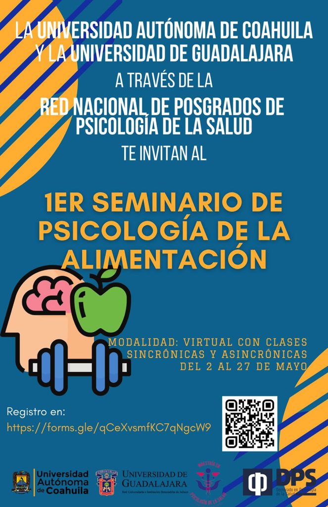 La Facultad de Psicología Unidad Saltillo de la Universidad Autónoma de Coahuila invita al Primer Seminario de Psicología de la Alimentación, el cual se llevará a cabo de manera virtual del 2 al 27 de mayo de 2022.