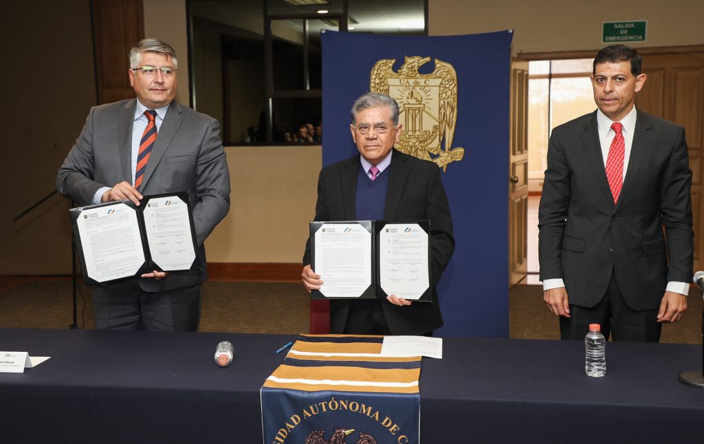 En la Sala de Seminarios “Emilio J. Talamás” de la Unidad Camporredondo, el documento fue signado por el rector de la máxima casa de estudios, Salvador Hernández Vélez y el presidente del Colegio de Notarios Públicos de Coahuila, Armando Luna Canales, y teniendo como testigo de honor al coordinador general de Vinculación e Innovación Productiva de la UA de C, Octavio Pimentel Martínez.