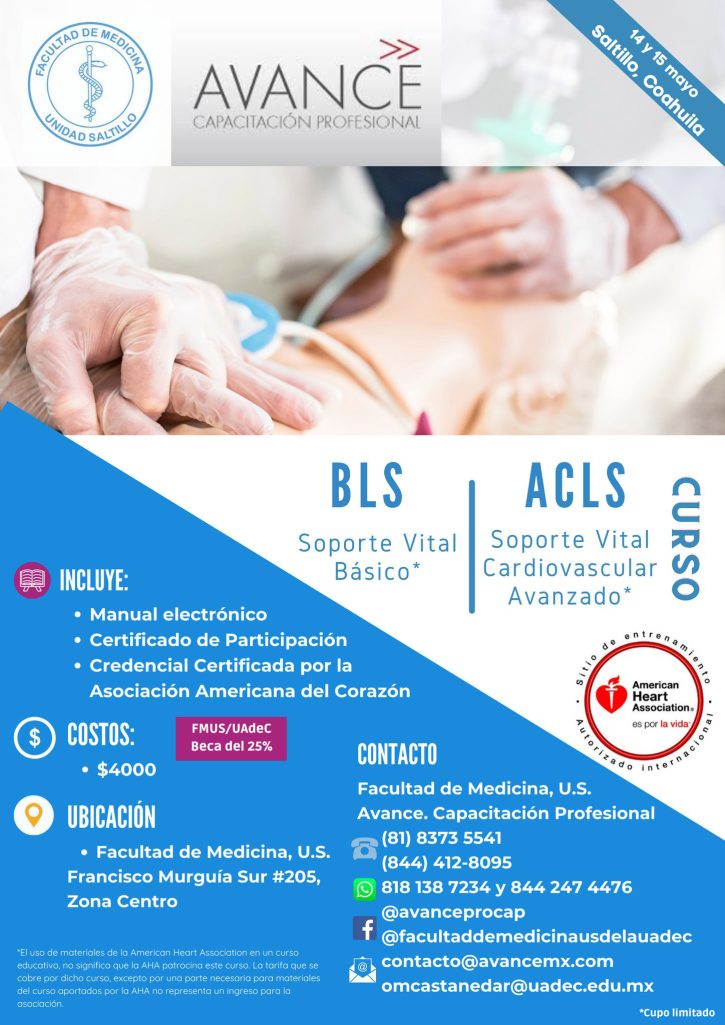 La Facultad de Medicina Unidad Saltillo de la Universidad Autónoma de Coahuila, invita a participar en el Curso de BLS Soporte Vital Básico y ACLS Soporte Vital Cardiovascular Avanzado, el cual se llevará a cabo en las instalaciones del plantel el 14 y 15 de mayo de 2022.