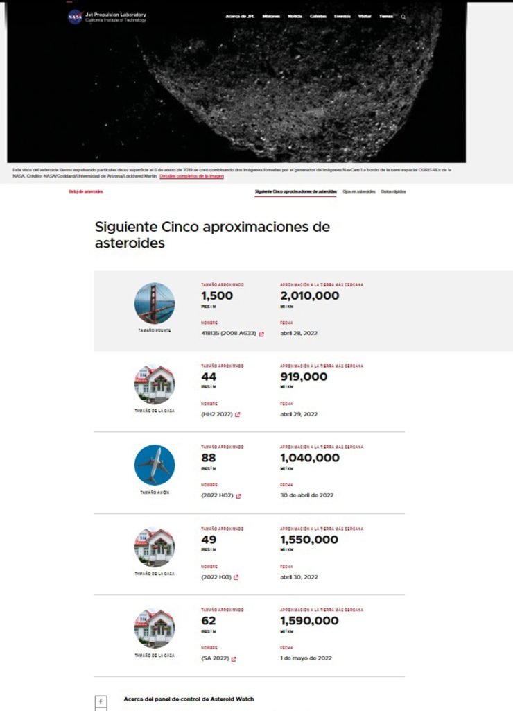A través de su sitio Asteroid Watch, el Laboratorio de Propulsión Jet de la NASA informa que del 28 de abril al 2 de mayo se espera el paso de una serie de objetos de menor tamaño “cerca” de nuestro planeta, además del AG33.