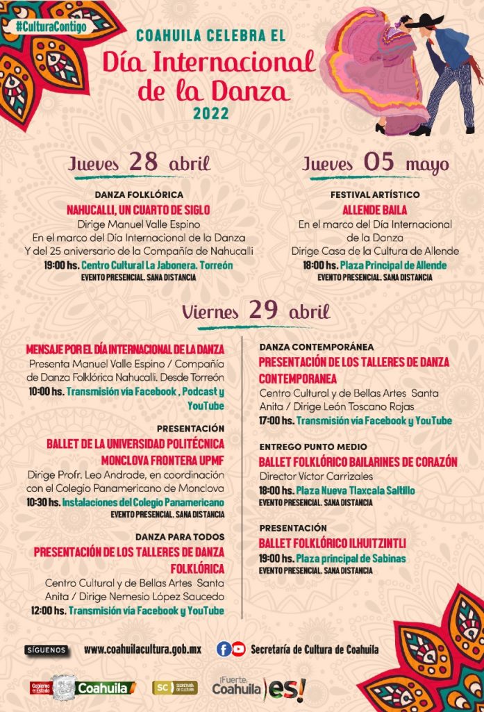 Con este motivo, según lo dio a conocer la Secretaria de Cultura del Estado, Ana Sofía García Camil, la SC realiza una agenda especial de actividades culturales, iniciando el jueves 28 de abril con la presentación de danza folklórica “NAHUCALLI, UN CUARTO DE SIGLO”, dirigida por Manuel Valle Espino, también como parte del 25 Aniversario de la Compañía de Nahucalli, en el Centro Cultural La Jabonera, de la Ciudad de Torreón, a las 19:00 horas.
