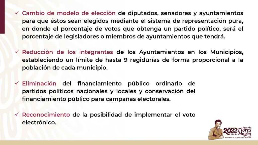 5.- Cambio de modelo de elección de diputados, senadores y ayuntamientos para que estos sean elegidos mediante el sistema de representación pura, en donde el porcentaje de votos que obtenga un partido político será el porcentaje de legisladores o miembros de ayuntamientos que tendrá.