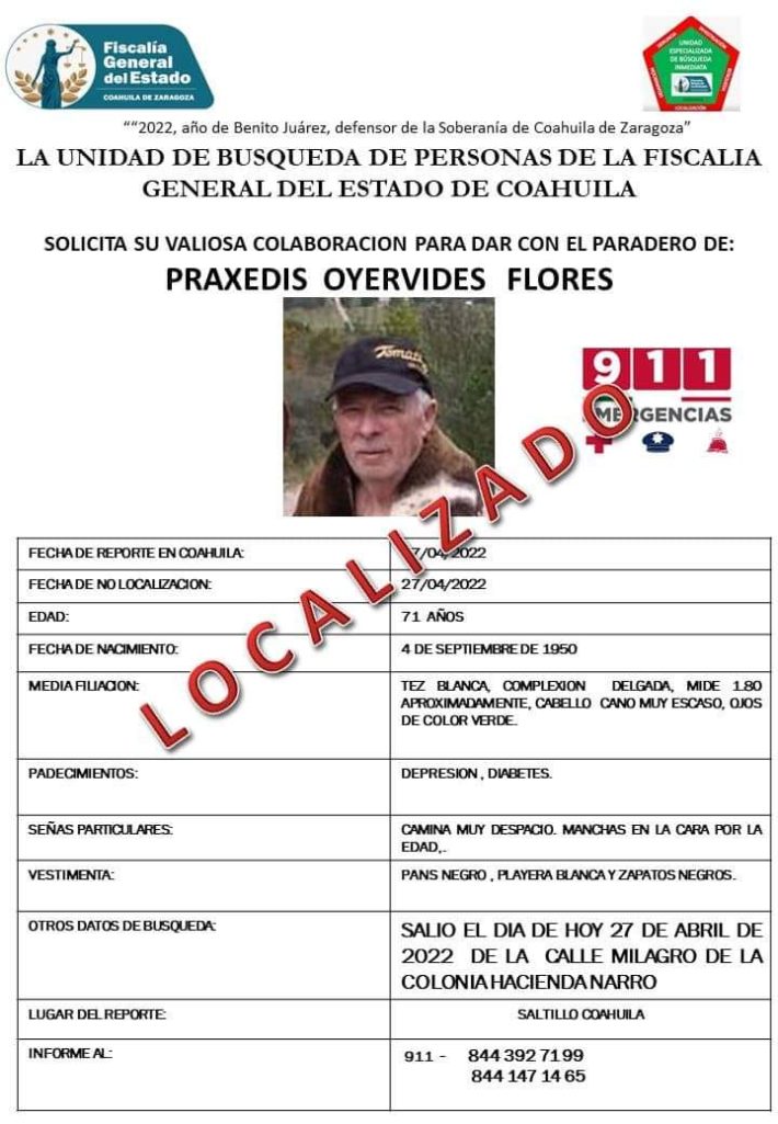 La Fiscalía General del Estado informó, mediante un comunicado, que derivado de trabajos de investigación en el que participaron autoridades estatales y municipales se logró localizar a Práxedis Oyervides Flores de 71 años, quien fue reportado como no localizado por sus familiares este miércoles en la colonia Hacienda Narro, en Saltillo; su ausencia fue por pérdida de memoria.
