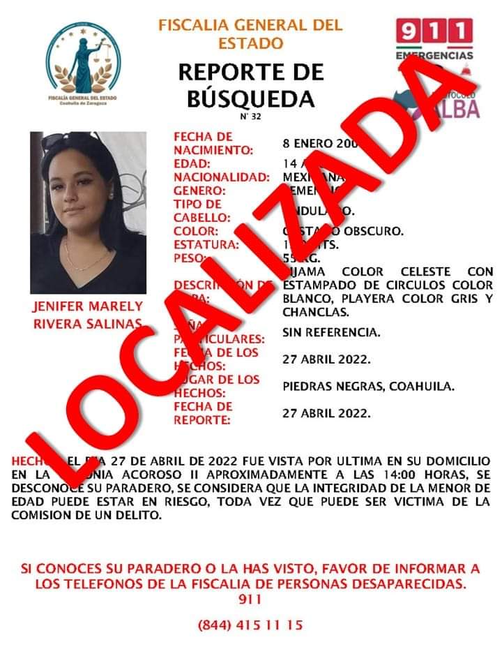 En otro asunto, en la ciudad de Piedras Negras, fue localizada en buen estado de salud Jenifer Marely Rivera Salinas, quien fue reportada como no localizada la noche del miércoles por sus familiares; derivado de una intensa búsqueda inmediata en la que participaron Agentes de Investigación Criminal, en Colaboración con policías de la Secretaría de Seguridad Pública del Estado y autoridades municipales, dio como resultado su pronta localización. Al entrevistarla manifestó que su ausencia fue voluntaria por una desavenencia familiar. Fue canalizada a la Procuraduría para las Niñas, Niños y la Familia.