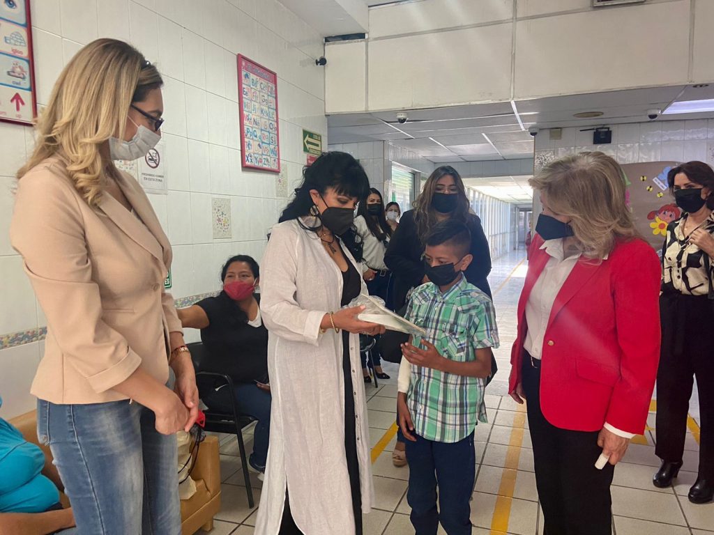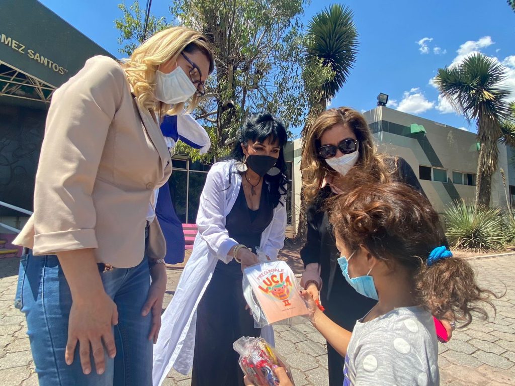 Durante el recorrido, la Presidenta del Voluntariado, en compañía del Director del Hospital del Niño, el doctor Carlos Oyervides García, hizo entrega de una serie de kits que contenían el cuento “Pregúntale a Lucia I y II”, una visera y cubrebocas.