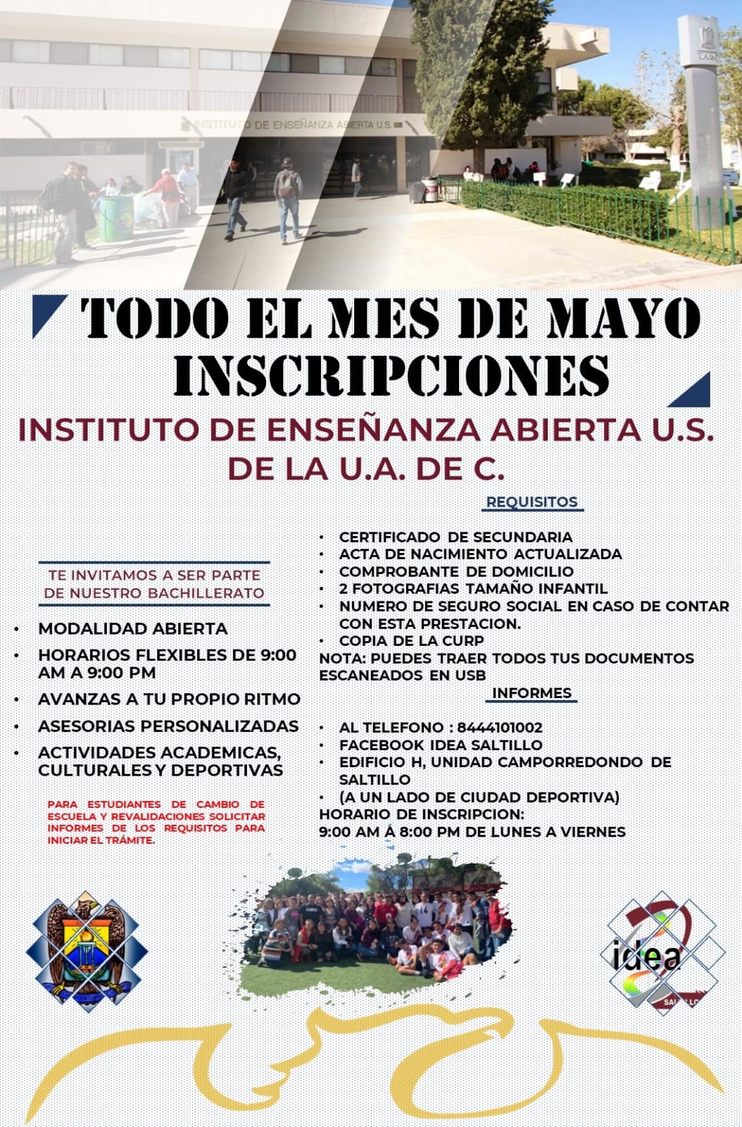 El Instituto de Enseñanza Abierta Unidad Saltillo de la Universidad Autónoma de Coahuila, abre la segunda convocatoria del año para inscripciones de bachillerato modalidad en línea, que se desarrollará durante el mes de mayo.