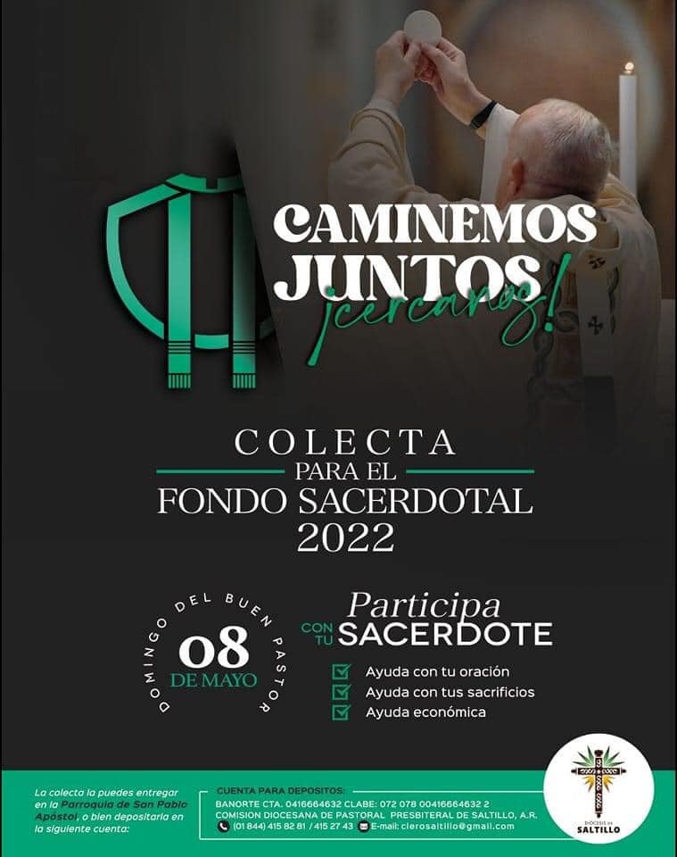 Para apoyar a sacerdotes que integran la Diócesis de Saltillo en su alimentación, vestimenta, acciones de evangelización, preparación académica, medicamentos y tratamientos médicos, esta organización religiosa convoca a la ciudadanía en general a participar en la Colecta para el Fondo Sacerdotal 2022.