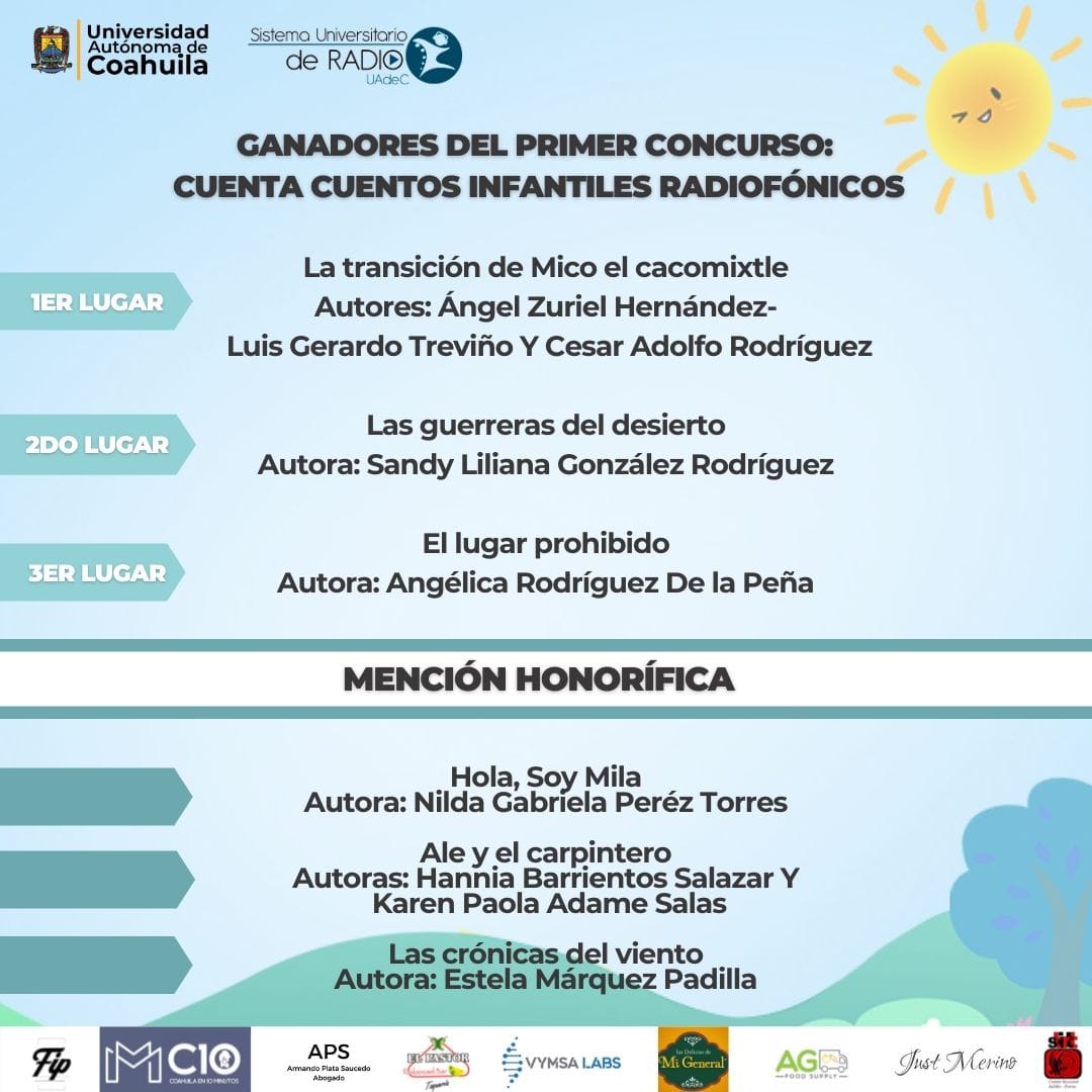 Con motivo de la celebración del Día del Niño y la Niña, la Universidad Autónoma de Coahuila a través del Sistema Universitario de Radio, llevó a cabo el Primer Concurso de Cuenta Cuentos Infantiles Radiofónicos donde convocó a estudiantes de nivel Bachillerato y Licenciatura del estado de Coahuila.