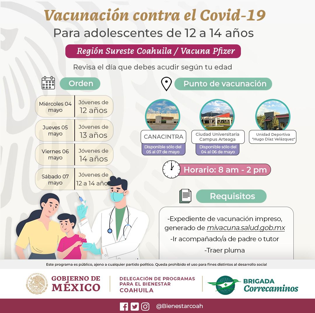 El coordinador de la vacunación antiCovid de la Secretaría del Bienestar en Coahuila, Carlos González Peña, informó a EL HERALDO que este miércoles dará inicio la aplicación de la primera dosis contra la Covid-19 en adolescentes de 12 a 14 años en Saltillo, Ramos Arizpe y Arteaga, con biológico Pfizer.