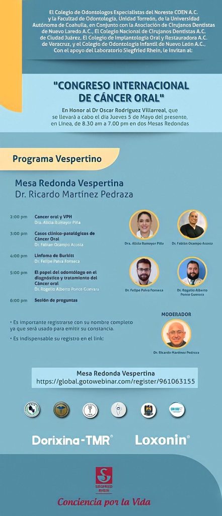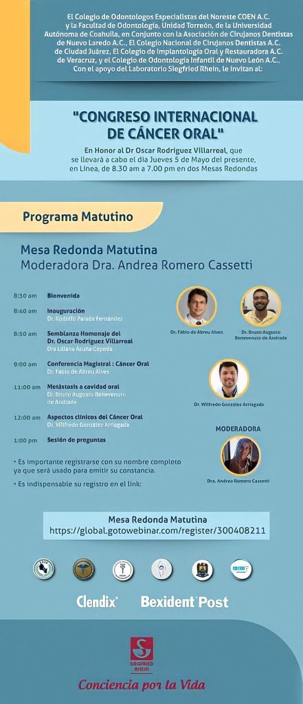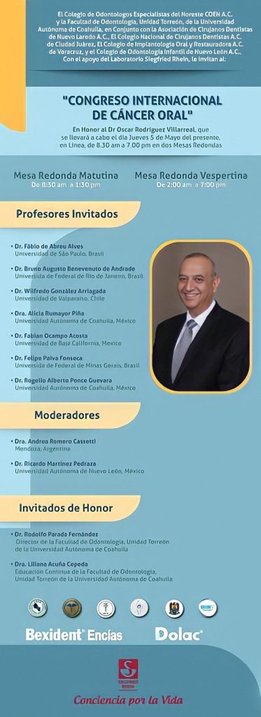Torreón, Coahuila.- La Universidad Autónoma de Coahuila a través de la Facultad de Odontología Unidad Torreón en conjunto con el Colegio de Odontólogos Especialistas del Noreste COEN A.C, la Asociación de Cirujanos Dantistas de Nuevo Laredo A.C, el Colegio Nacional de Cirujanos Dentistas A.C de Ciudad Juárez, el Colegio de Implantología Oral y Restauradora A.C de Veracruz y el Colegio de Odontología Infantil de Nuevo León A.C con el apoyo del Laboratorio Siegfried Rhein, invitan al «Congreso Internacional de Cáncer Oral» que se realizará de manera virtual el 5 de mayo de 2022 de 8:30 a 19:00 horas.