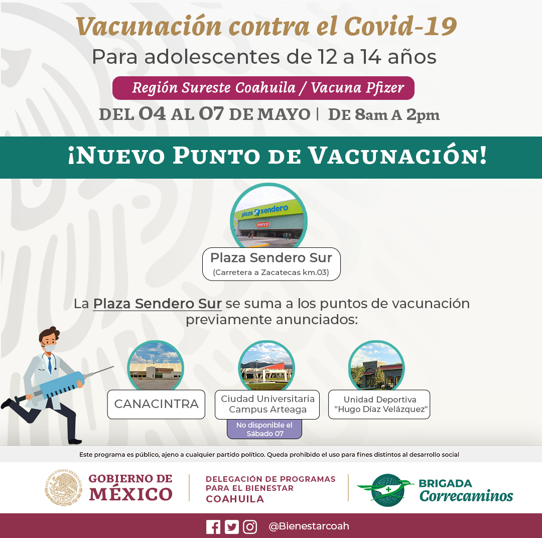 De acuerdo con información del área de Comunicación Social de la Secretaría del Bienestar en Coahuila, a partir de este jueves se habilitará un módulo para la aplicación de la vacuna contra la Covid-19 en Plaza Sendero Sur de Saltillo, con la finalidad de inocular a adolescentes de 12 a 14 años.