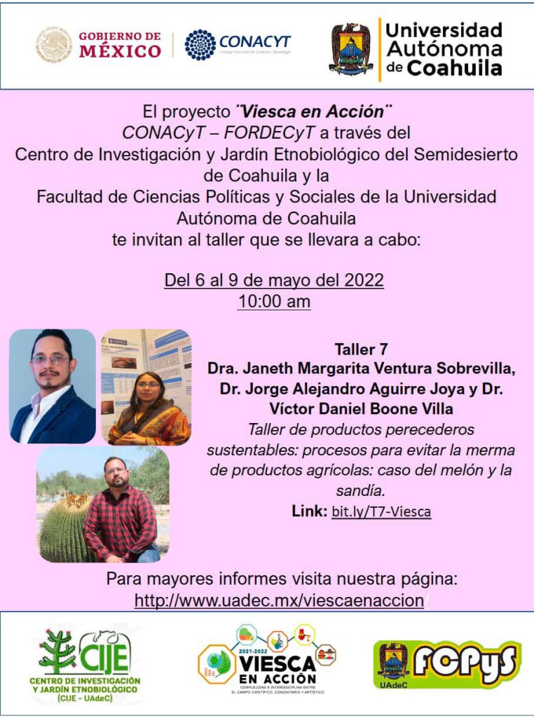 El Taller será impartido del 6 al 9 de mayo en las instalaciones del CIJE en el municipio de Viesca, informó Jorge Sadi Durón, coordinador del proyecto, quien dijo que las actividades iniciarán a las 10:00 horas, y estarán bajo la intervención de la Dra. Janeth Margarita Ventura Sobrevilla, el Dr. Jorge Alejandro Aguirre Joya y el Dr. Víctor Daniel Boone Villa, quienes abordarán el tema desde distintas disciplinas como Alimentos y Bioquímica.