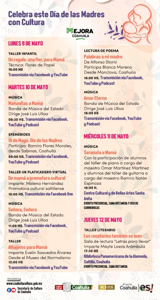 El Gobierno de Coahuila, a través de la Secretaría de Cultura, festeja a las madres con un programa cultural híbrido en las diversas regiones del estado, recordando esta importante celebración de las familias mexicanas.