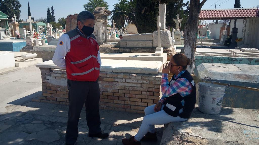 Informó que personal de Protección Civil revisa que no existan situaciones de riesgo como la presencia de lápidas fracturadas o abiertas, las cuales puedan representar un peligro potencial por caída de personas.