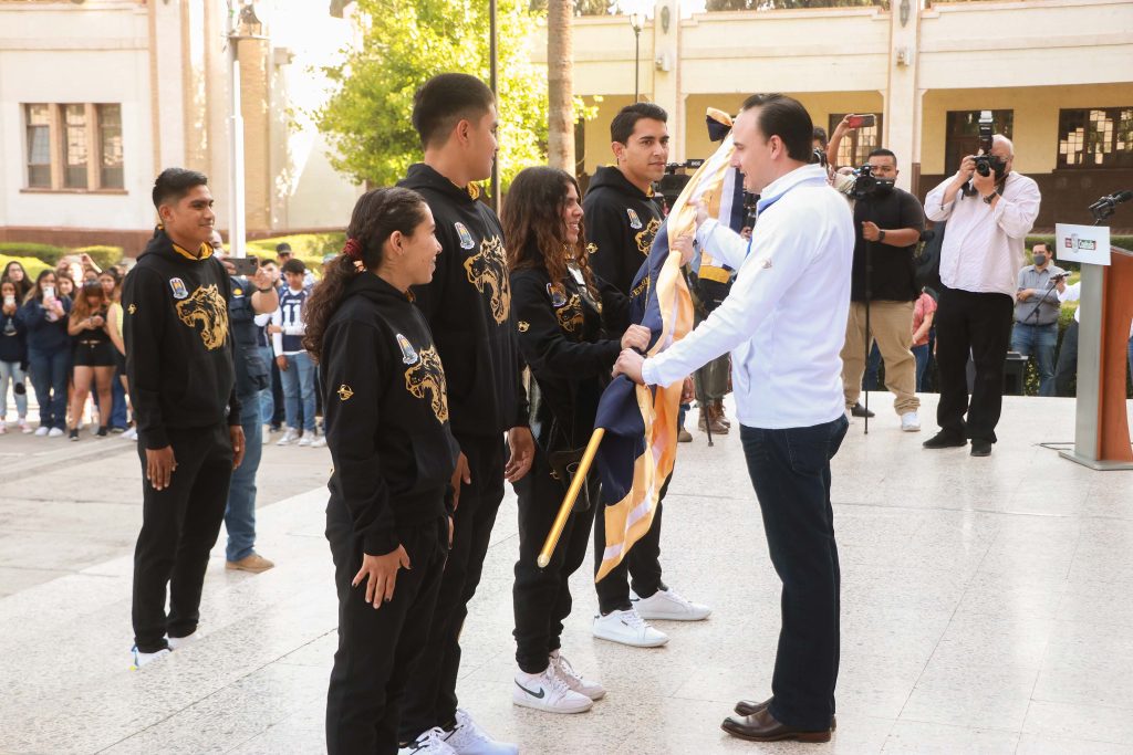El estandarte universitario fue entregado por el secretario de Inclusión y Desarrollo Social, Manolo Jiménez Salinas, recibiéndolo la escolta conformada por Jade Benavides (Karate), Gregorio Nájera (Judo), Oswaldo Martínez (Fútbol Bardas), Paola Espinoza (Rugby), Melchor Morín (Atletismo) y Sofía Guerrero (Ajedrez).