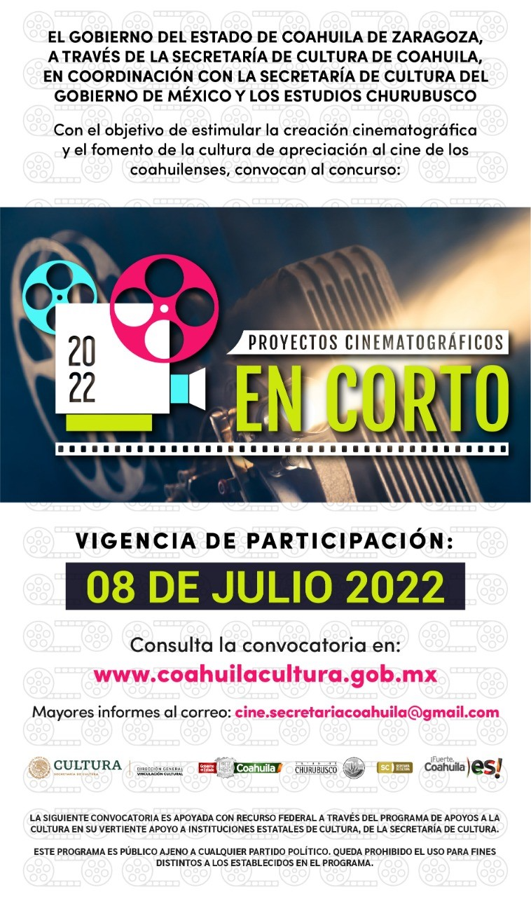 Por último, el funcionario estatal recordó que se encuentra abierta la convocatoria Proyectos Cinematográficos en Corto 2022, y que las bases se encuentran en la página oficial de la Secretaría de Cultura www.coahuilacultura.gob.mx y cierra el próximo 8 de julio , para mayores informes se puede enviar un correo a cine.secretariacoahuila@gmail.com. (EL HERALDO)
