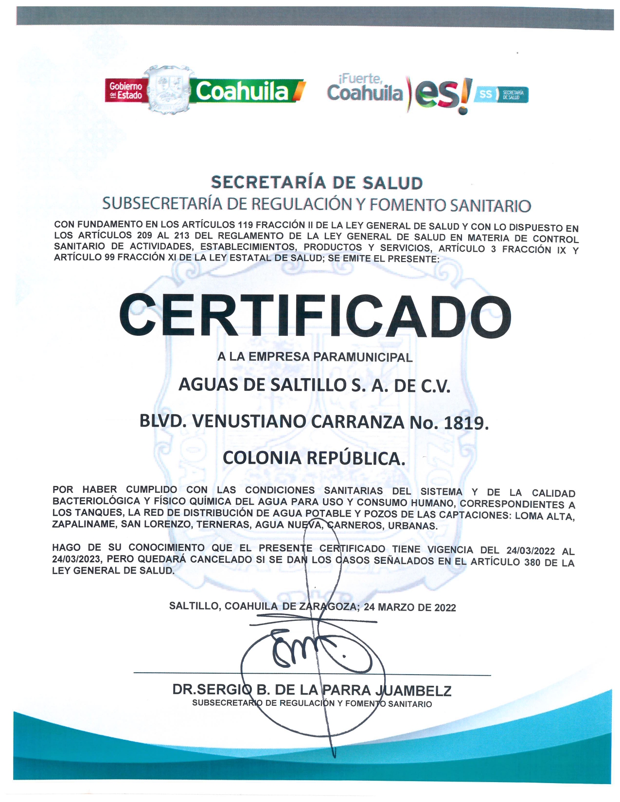 Por séptimo año consecutivo el Estado de Coahuila, a través de Secretaría de Salud de Coahuila otorgó a la empresa Aguas de Saltillo (AGSAL) el certificado que acredita que el agua es potable en Saltillo.