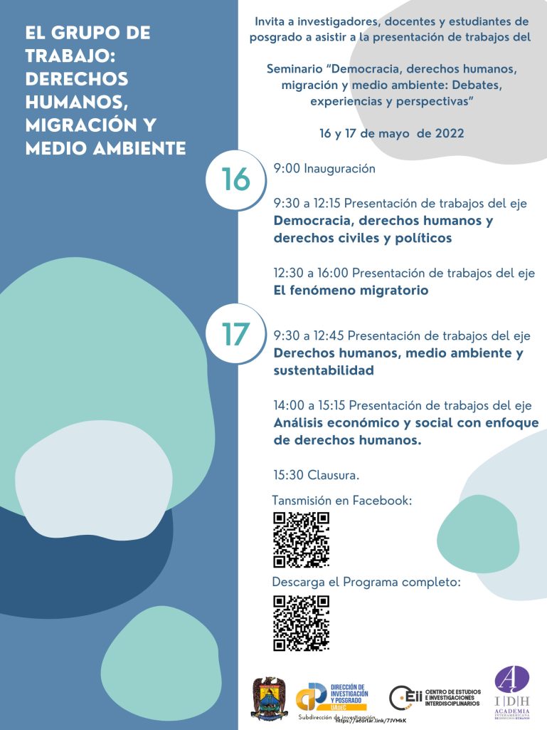 La Universidad Autónoma de Coahuila a través de la Dirección de Investigación y Posgrado DIP, en coordinación con el Centro de Estudios e Investigaciones Interdisciplinarias CEII y la Academia Interamericana de Derechos Humanos AIDH, invitan a la presentación de trabajos del Seminario “Democracia, Derechos Humanos, Migración y Medio Ambiente: Debates, Experiencias y Perspectivas”, los días 16 y 17 de mayo a través de Zoom.