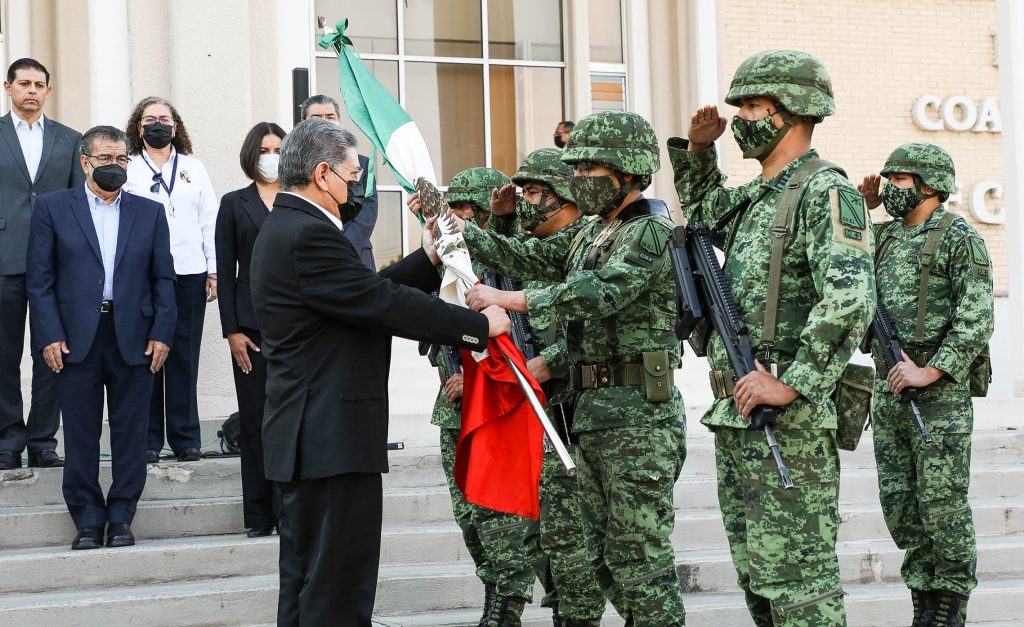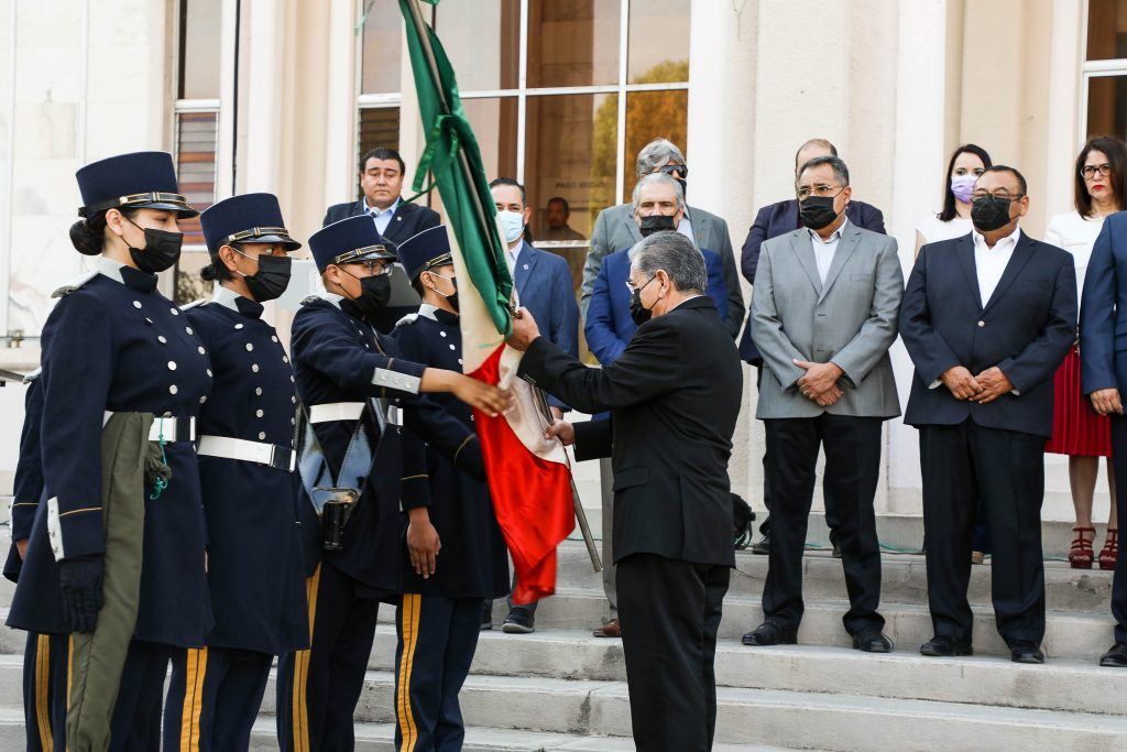 Encabezada por el rector de la máxima casa de estudios, Salvador Hernández Vélez, el secretario de Educación, Francisco Saracho Navarro y el coronel de Infantería, Roberto René Carranza Solórzano, jefe del Estado Mayor de la VI Zona Militar, en la ceremonia se contó con la participación de la escolta y banda de guerra del 69 Batallón de Infantería de la VI Zona militar, la escolta de la UA de C.