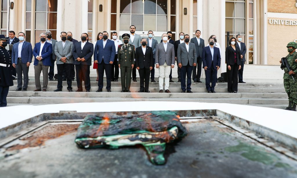 Ante alumnos, trabajadores y funcionarios de la administración central, durante el acto, la escolta de la UA de C entregó al Rector el lábaro patrio y este hizo lo propio a la escolta del 69 Batallón de Infantería de la VI Zona militar, quienes procedieron a colocarla en el pebetero para posteriormente incinerarla.