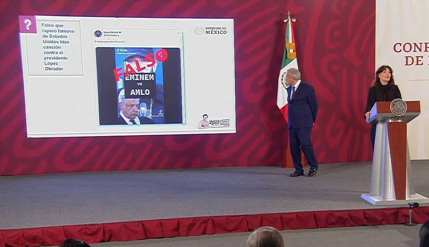 #ConferenciaPresidente. Es falso que el rapero Eminem haya compuesto una canción en contra de @lopezobrador_ , destaca @_LizVilchis en #QuienEsQuienEnLasMentiras. pic.twitter.com/cErOzTP9VY